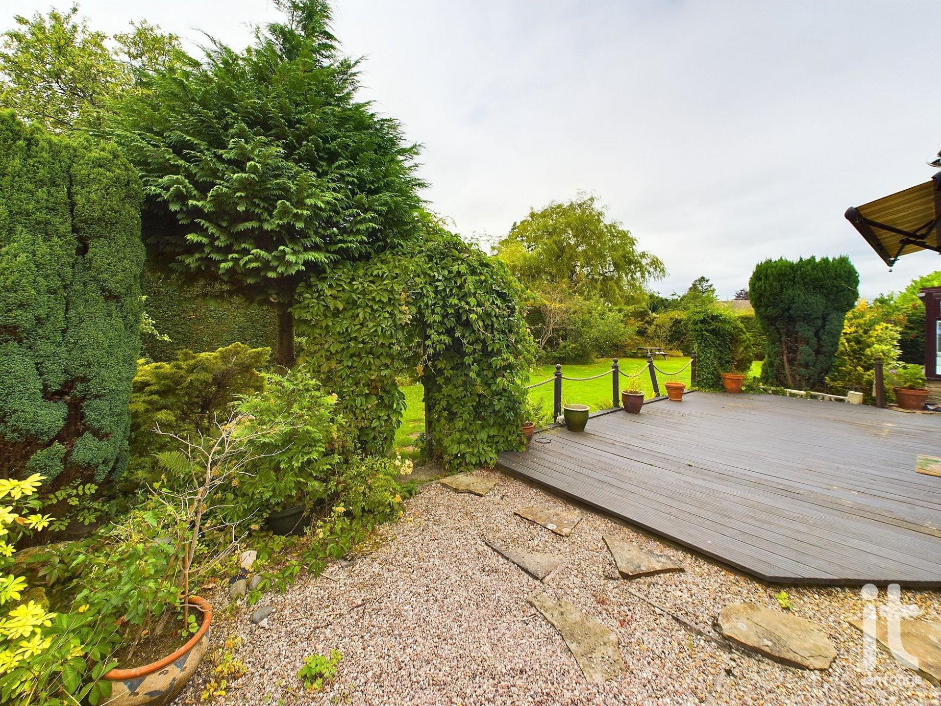 To the front there is a double driveway leading to the garage with additional parking down the side of the property under a brick built carport. There is flagged pathway leading to the front door, a lawned area with planted borders. The side of the property is mainly laid to lawn and wraps round to the rear garden which is also lawned and has mature trees and planting. There is also a feature raised decking area providing a large seating area.