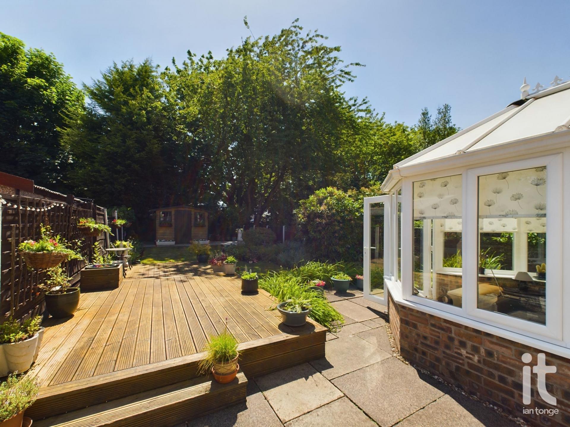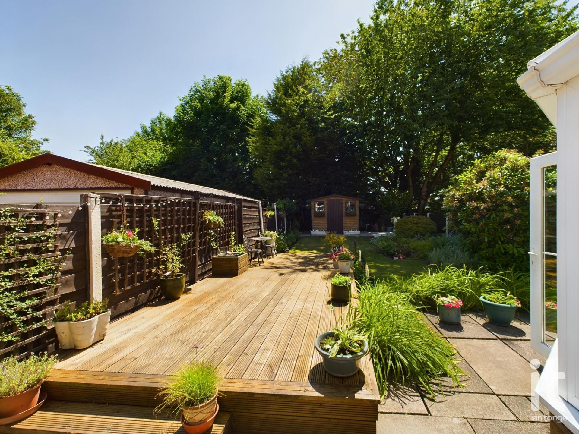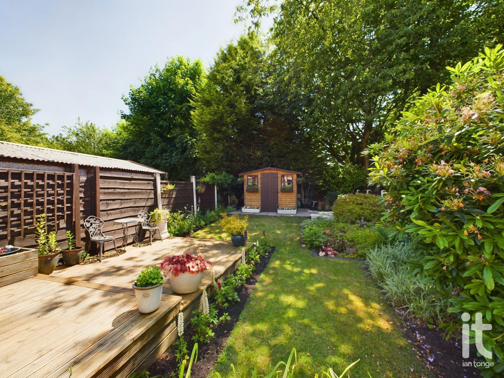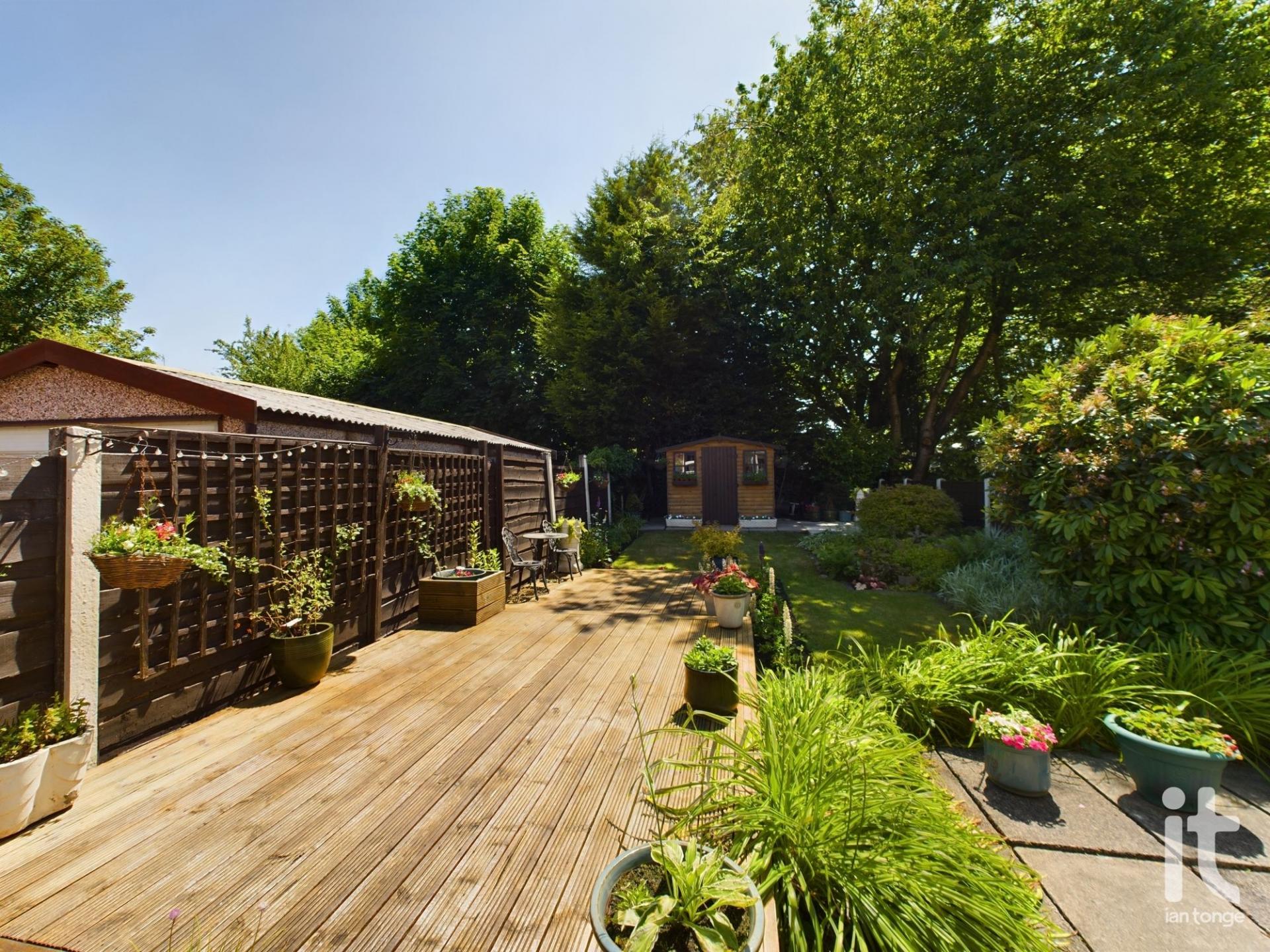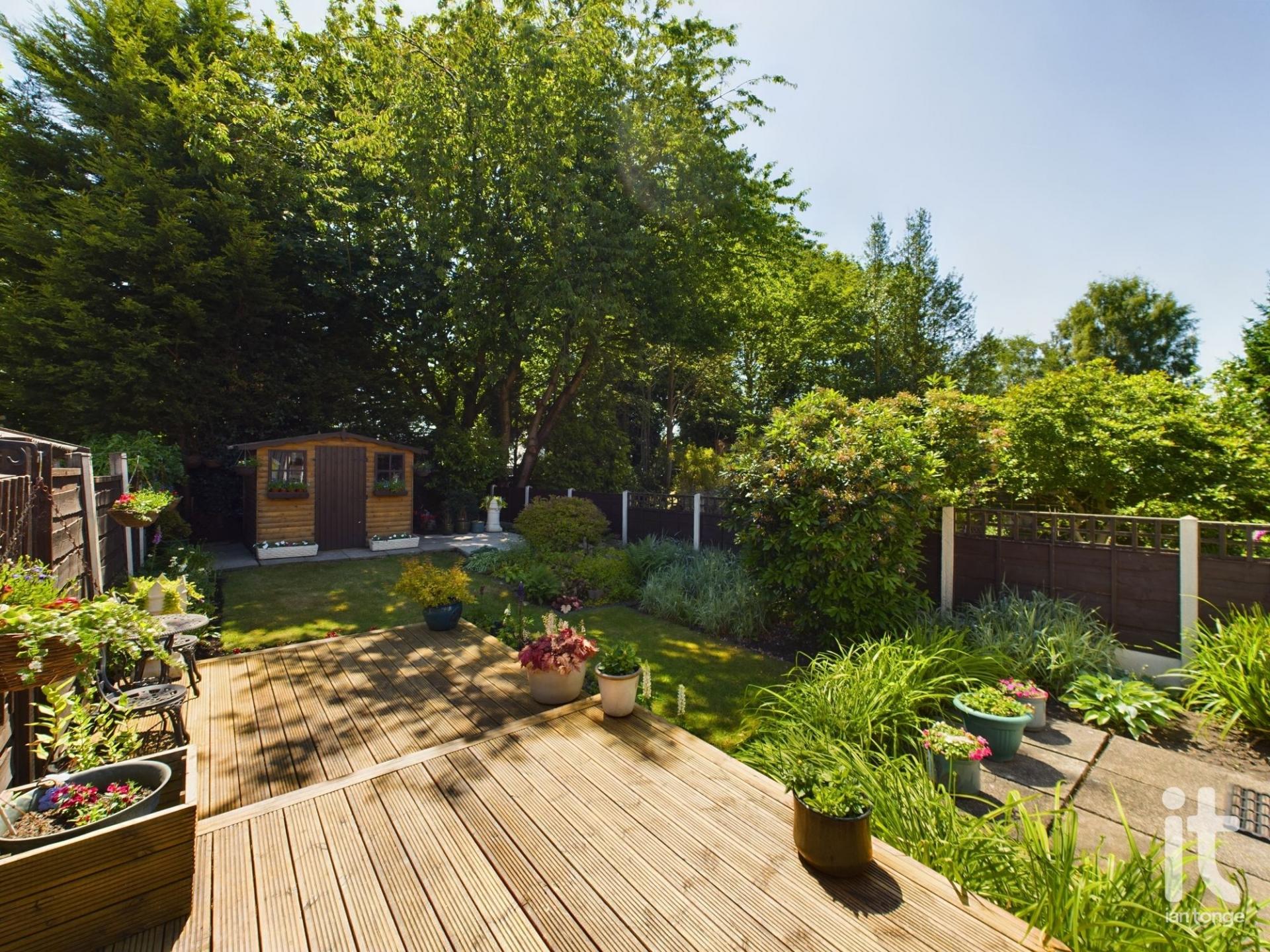 To the front aspect there is a driveway, lawned area with stocked borders and brick wall. The rear garden is enclosed and has been landscaped with feature decking area, flagged patio, lawn with stocked borders and summerhouse at the bottom of the garden.