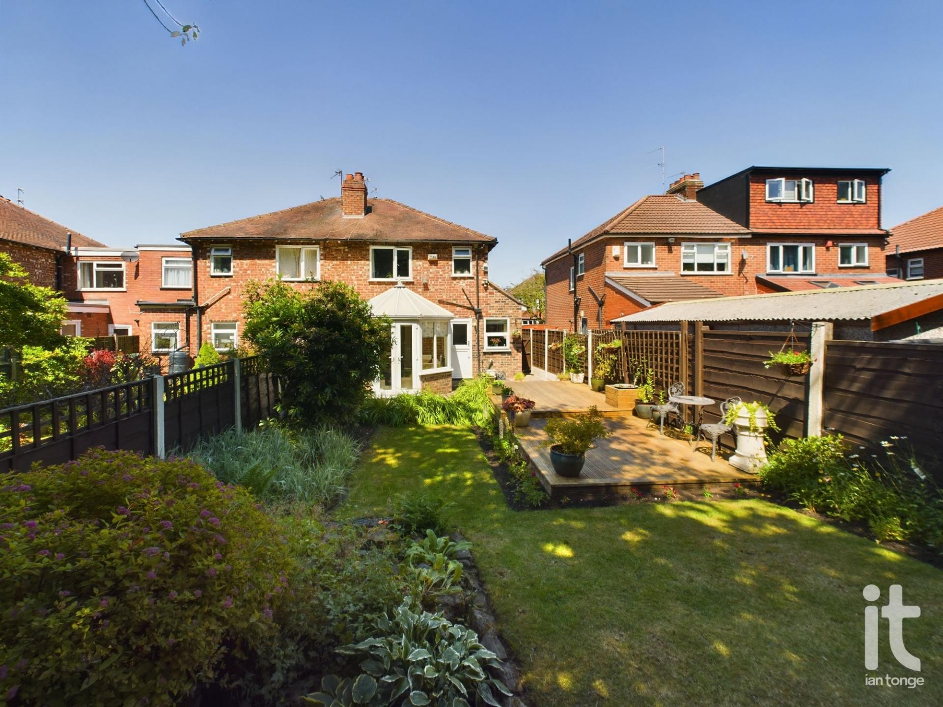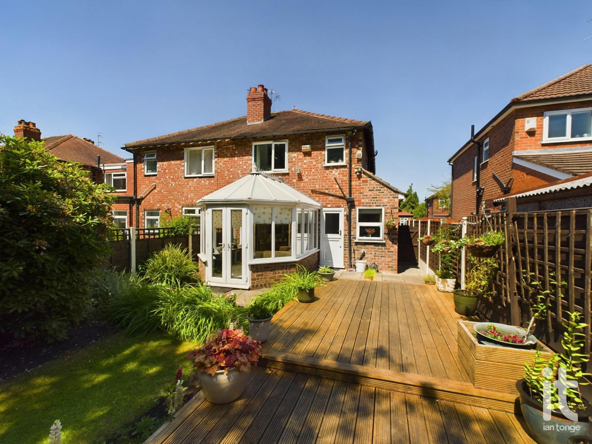 Attractive bay fronted traditional three bedroomed semi detached house which is located on a small cul-de-sac on the fringe of Hazel Grove village. The property comprises of entrance hallway, lounge, extended kitchen with archway leading into the dining room, feature conservatory, landing, three bedrooms and white three piece bathroom suite. Outside there are landscaped gardens with the front providing off road parking and the rear garden not overlooked with feature decking area. The property also benefits from uPVC double glazing and is warmed by gas central heating.