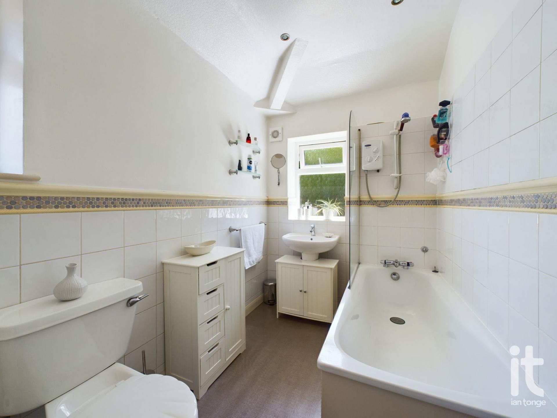 uPVC double glazed window to the rear aspect, white suite comprising of panel bath with shower over, pedestal wash basin with storage underneath, low level W.C., part tiled walls, ceiling downlighters, radiator.