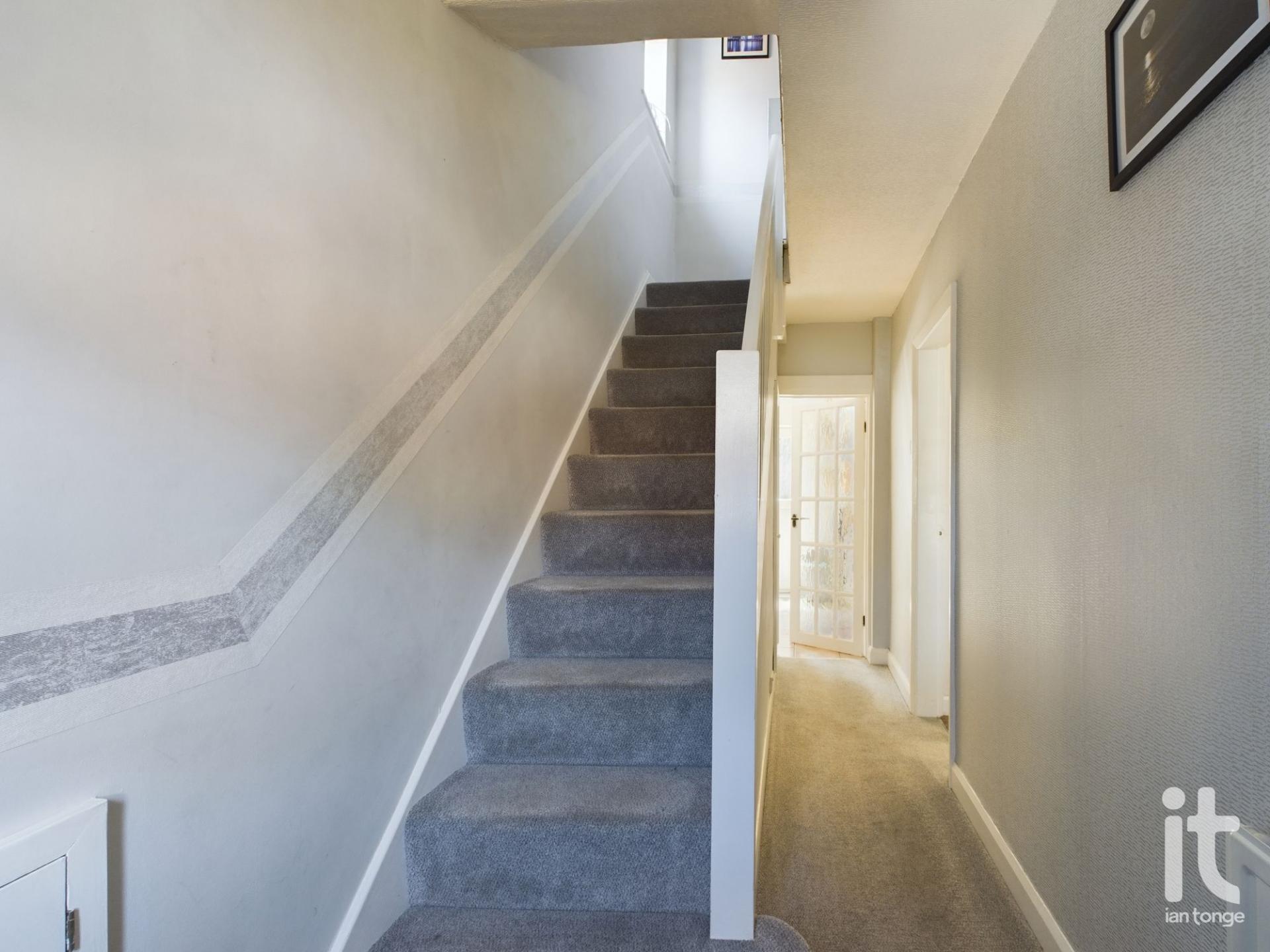 uPVC entrance door, radiator, spindle staircase leading to the first floor, understairs storage cupboard housing Vaillant central heating boiler.