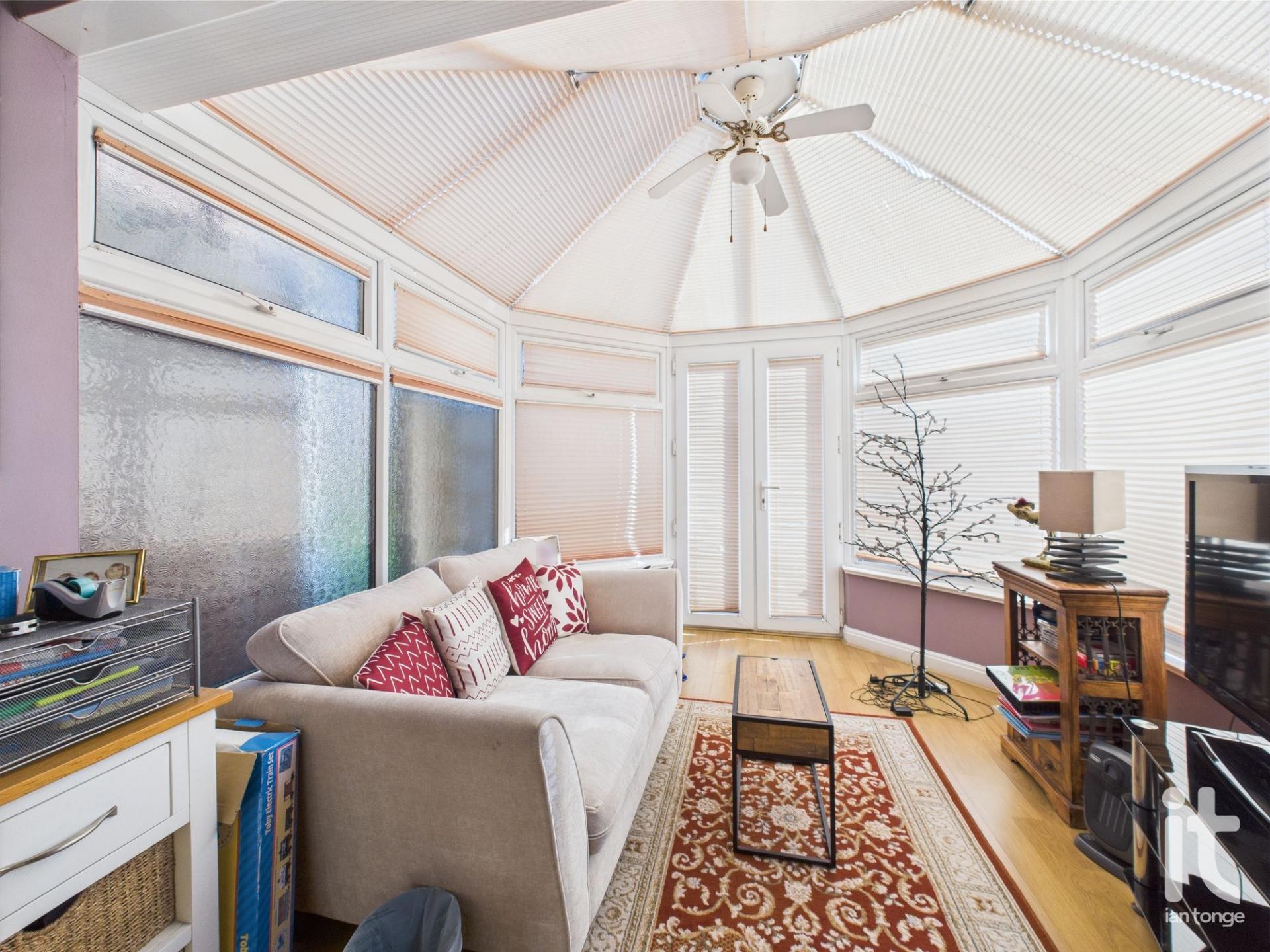 Brick base, uPVC frame, double glazed windows, conservatory roof, radiator, laminate flooring, TV aerial, double doors leading to the garden.