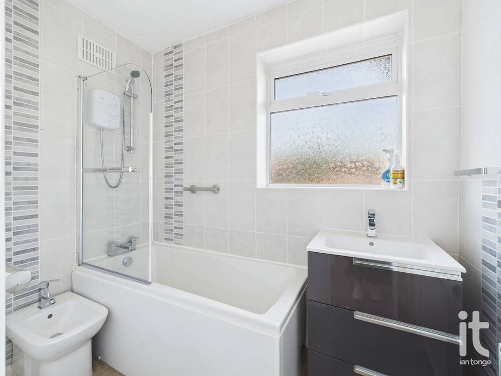 uPVC double glazed window to front aspect, fitted suite comprising of:- panelled bath with shower over, vanity sink unit and storage, bidet. Radiator, half tiled walls.