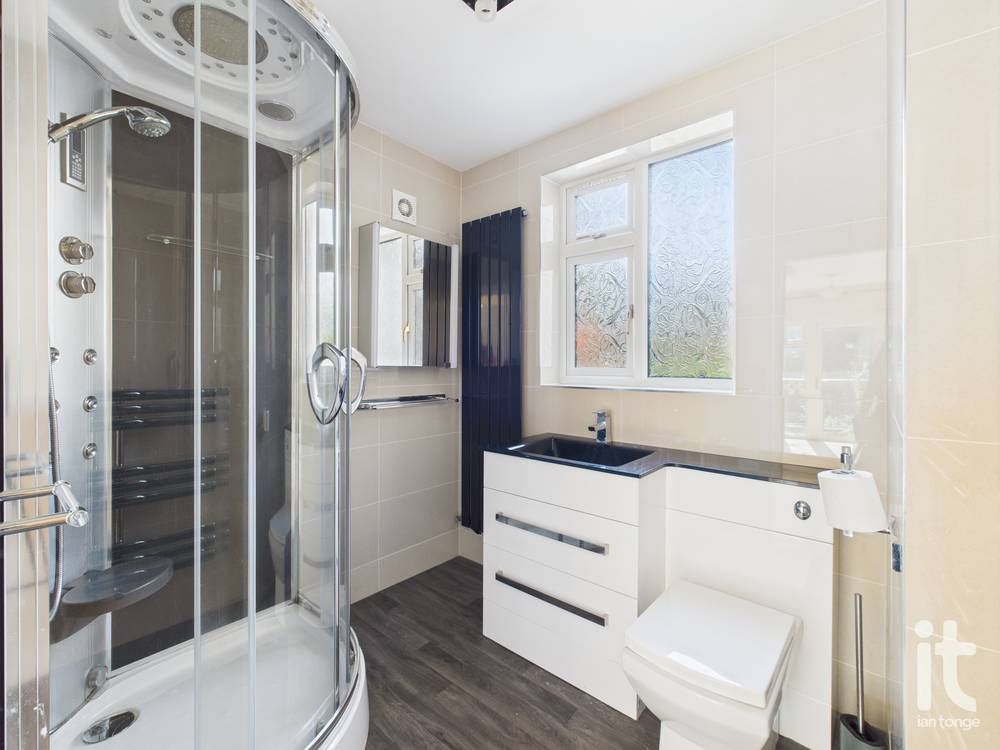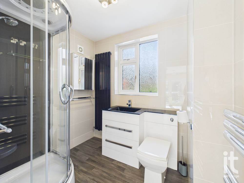 uPVC double glazed window to front aspect, fitted suite comprising of:- corner shower unit, vanity sink and W.C unit, column radiator, tiled walls, chrome heated towel rail.