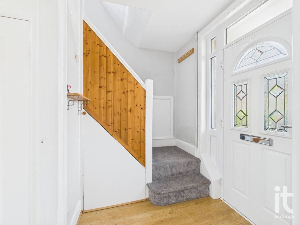 Composite entrance door, laminate flooring, understair storage cupboard, meter cupboard, radiator, stairs leading to first floor.