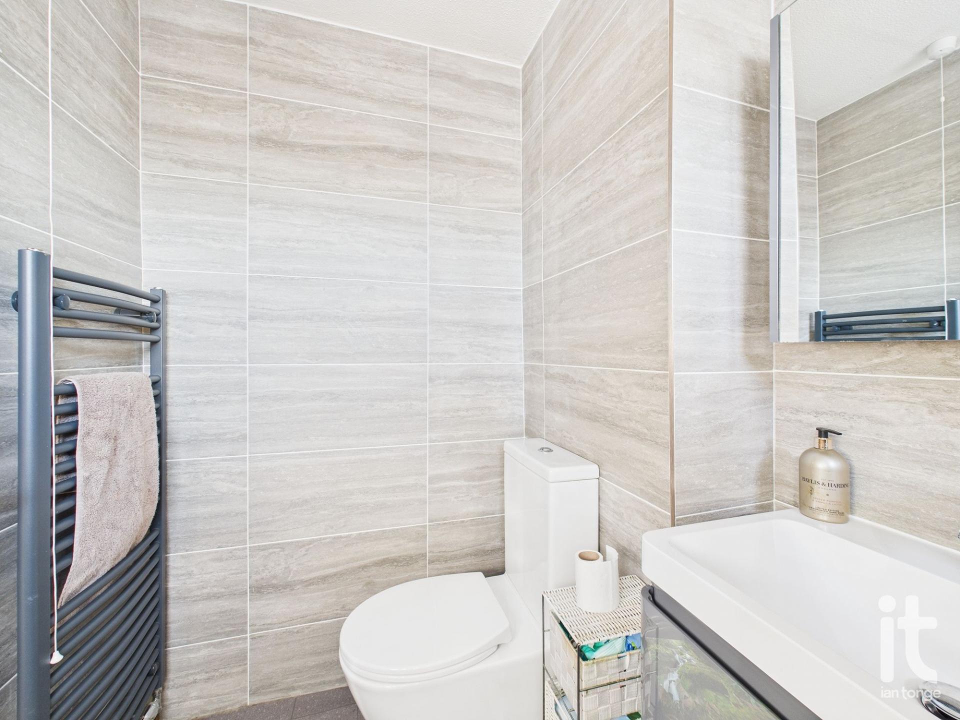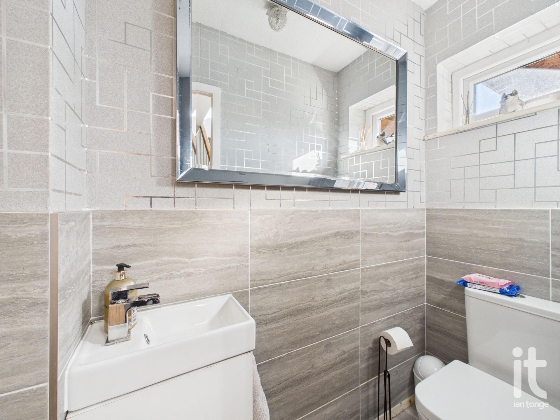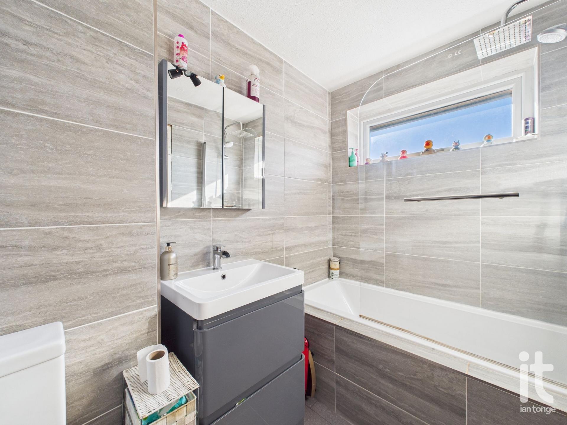 uPVC double glazed window to the side aspect, modern suite comprising of low level W.C., tiled walls, panel bath with screen and shower over, vanity sink, towel radiator.