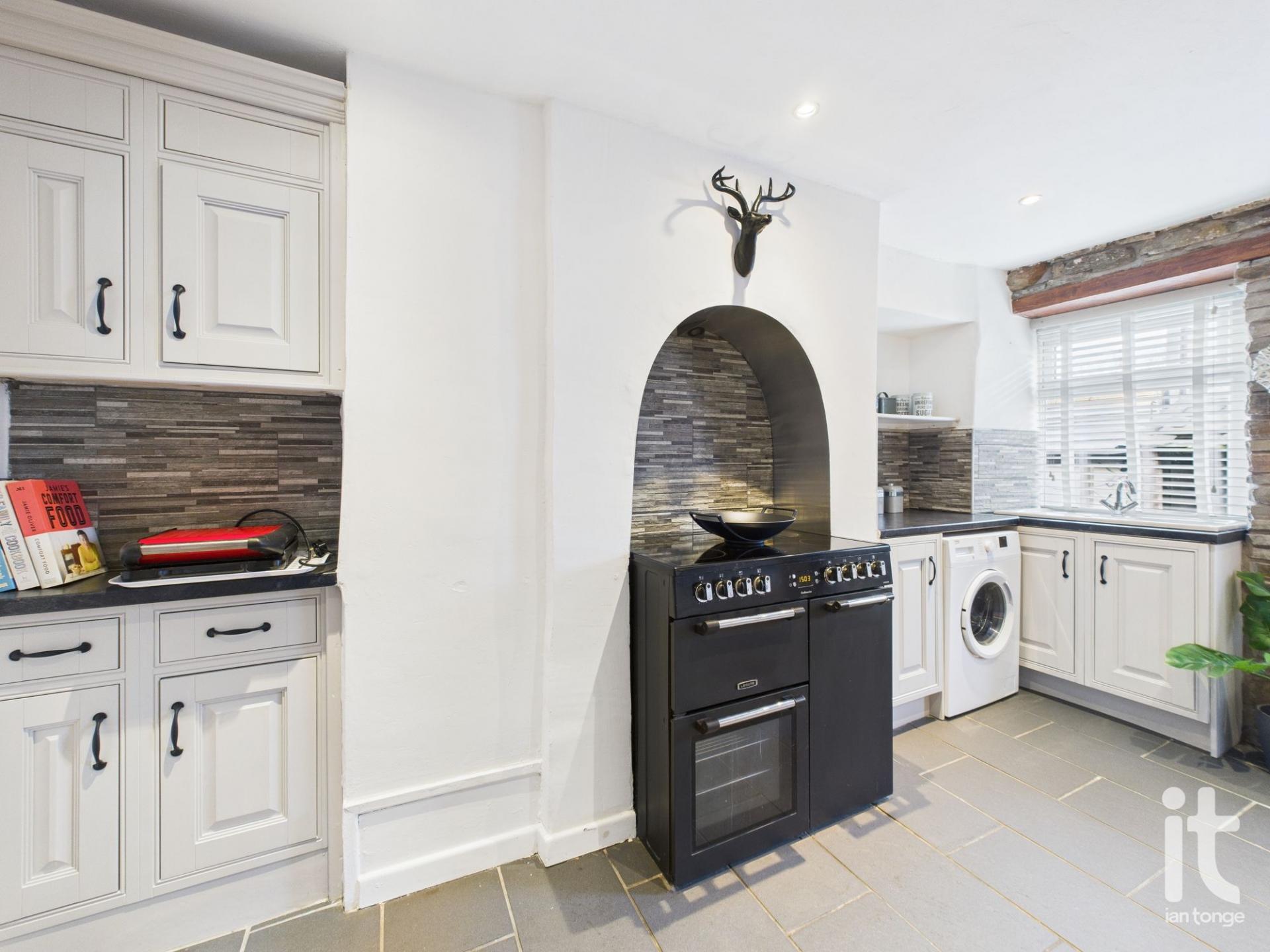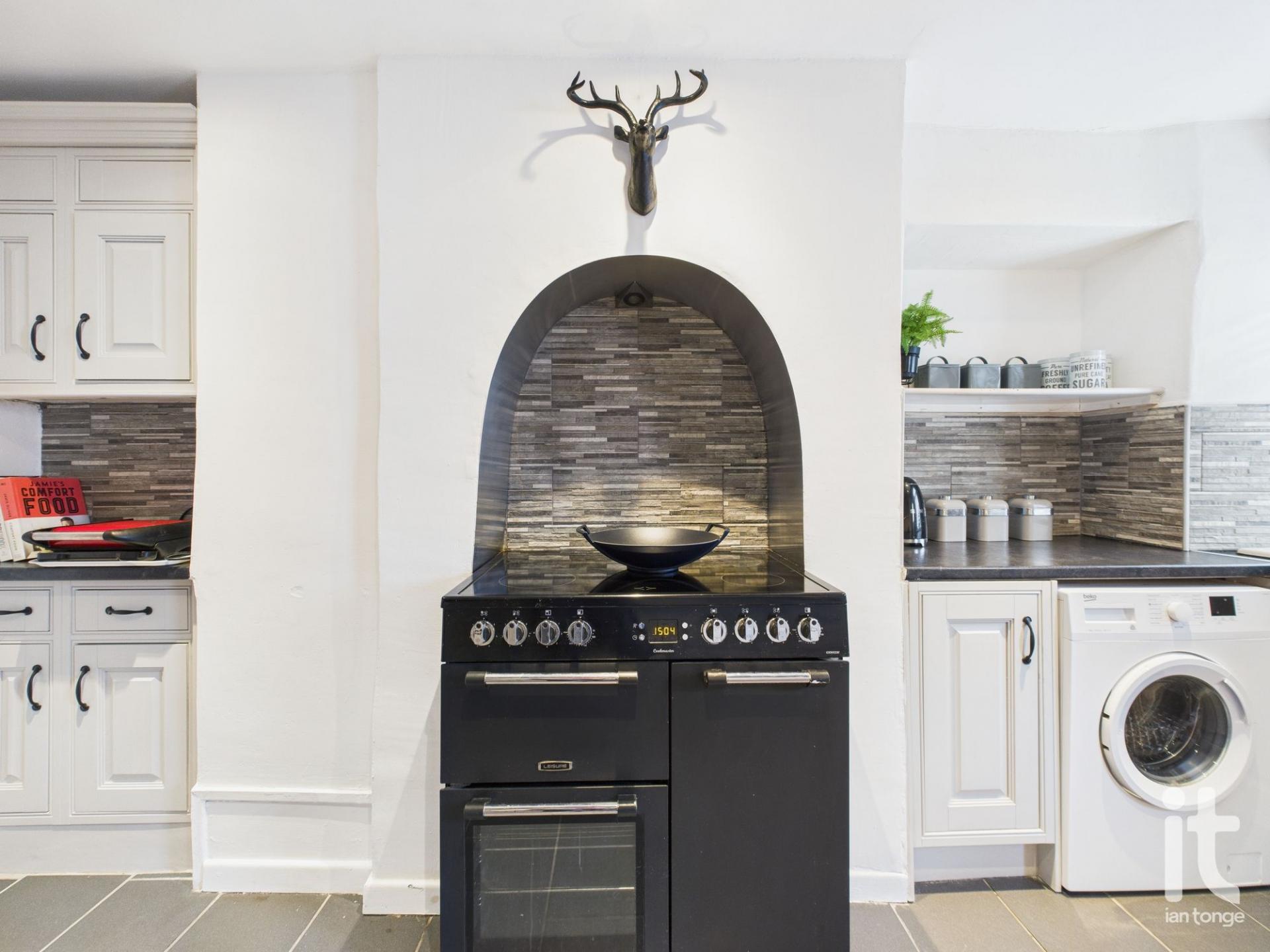 uPVC double glazed door leading to courtyard area, uPVC double glazed window to rear aspect. Range of fitted wall and base units with worksurfaces incorporating enamel sink with chrome mixer tap. Feature Cookmaster oven with electric hob set in alcove, plumbing for automatic washing machine, space for tall fridge/freezer, space for tumble dryer and storage. Radiator, tiled floor.