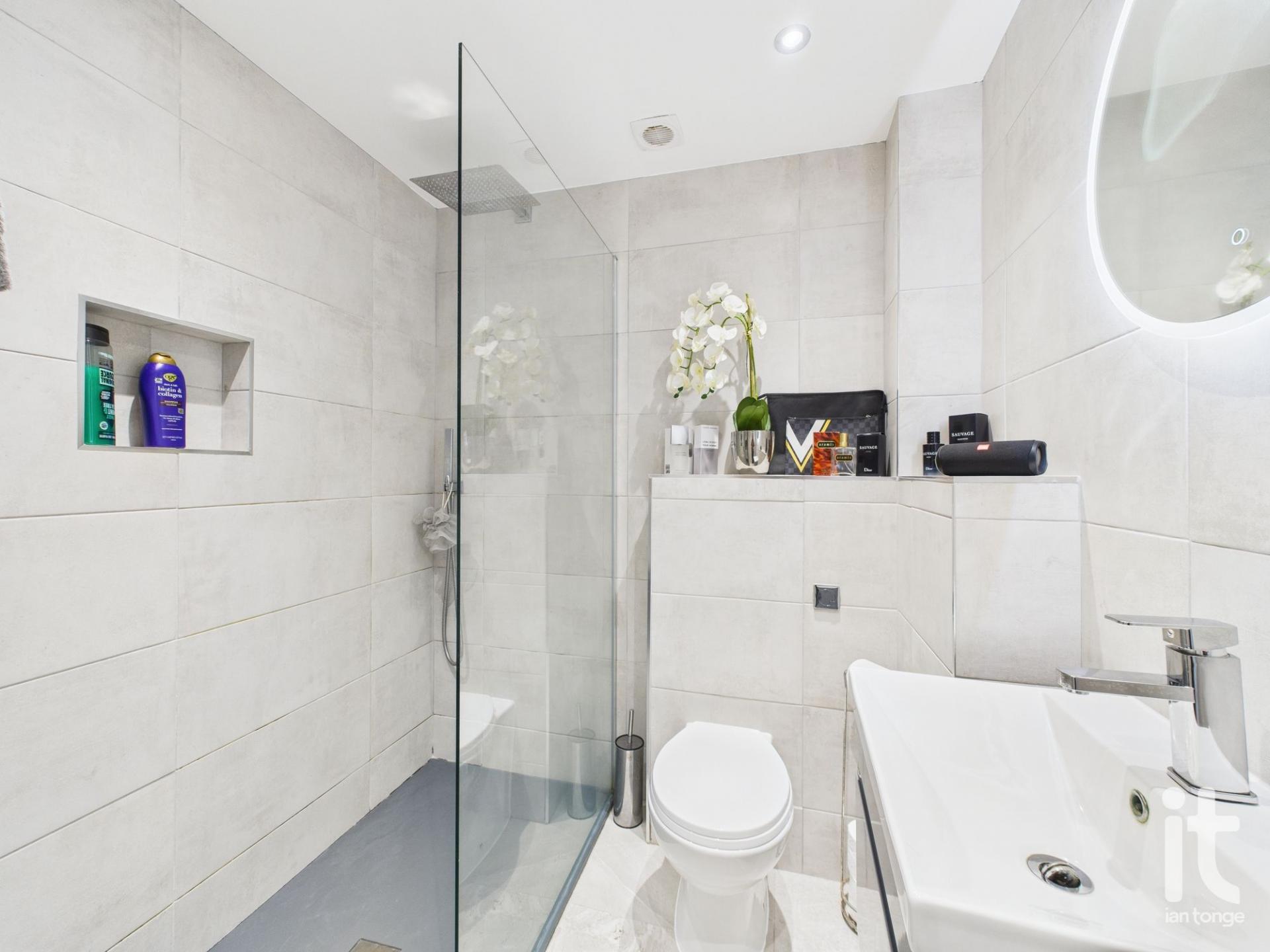 Large walk-in shower with glazed screen and chrome fittings, floating white vanity sink unit with storage below, back to wall W.C. Chrome heated towel rail, extractor fan, fully tiled walls and floor.