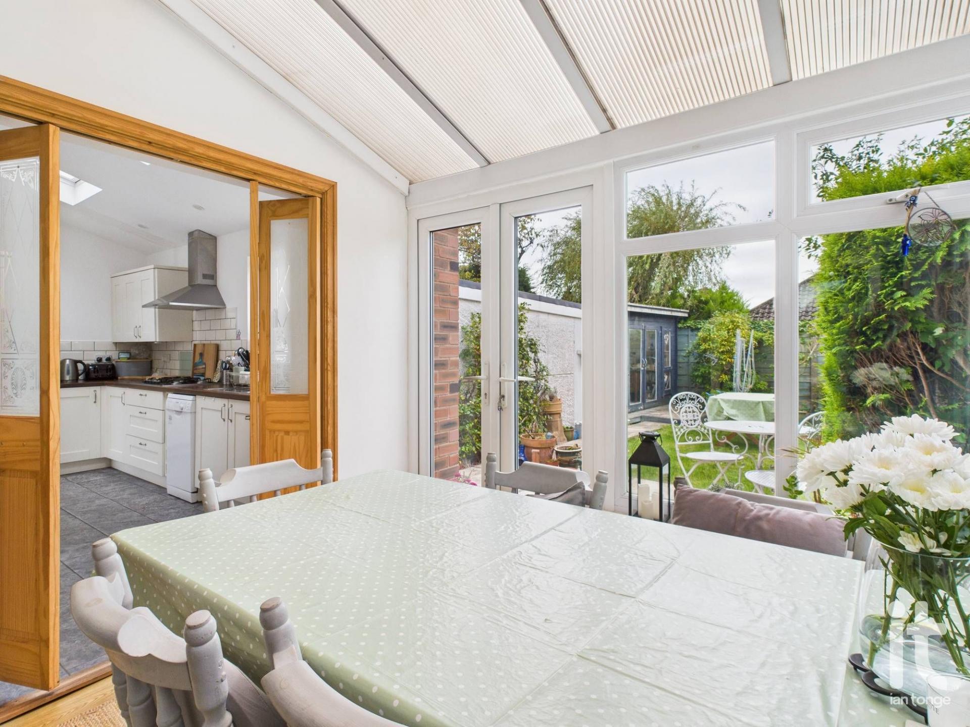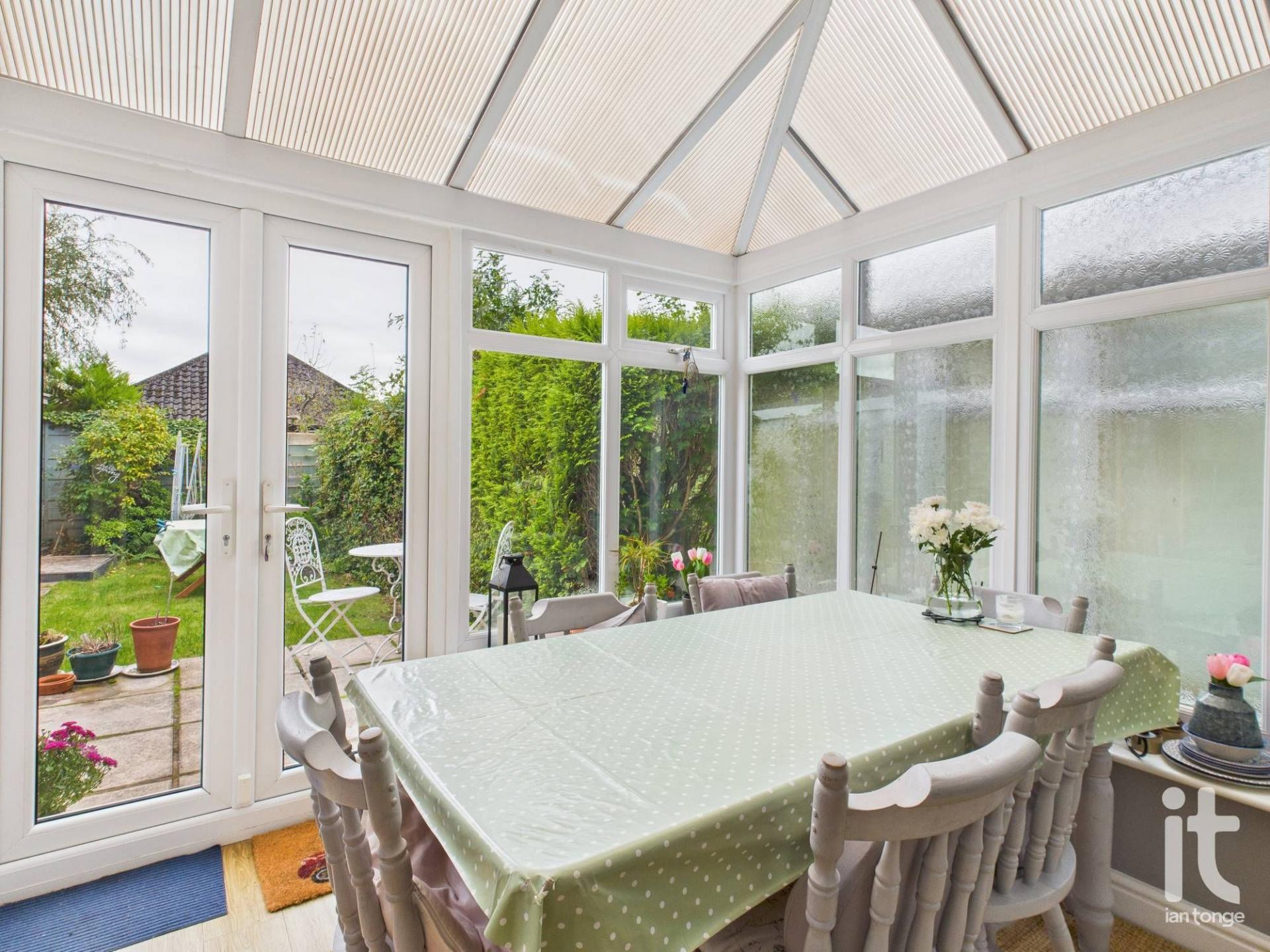 uPVC double glazed conservatory with polycarbonate roof, uPVC double glazed double doors leading out to garden area, column radiator.