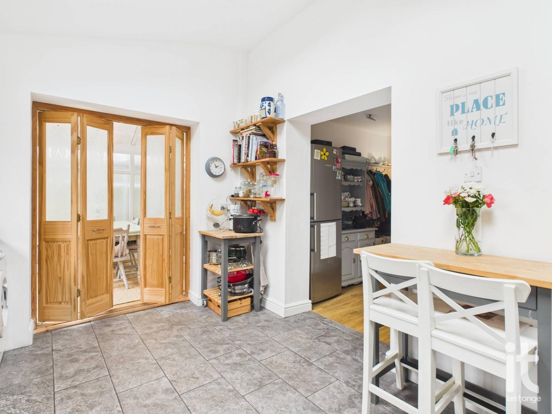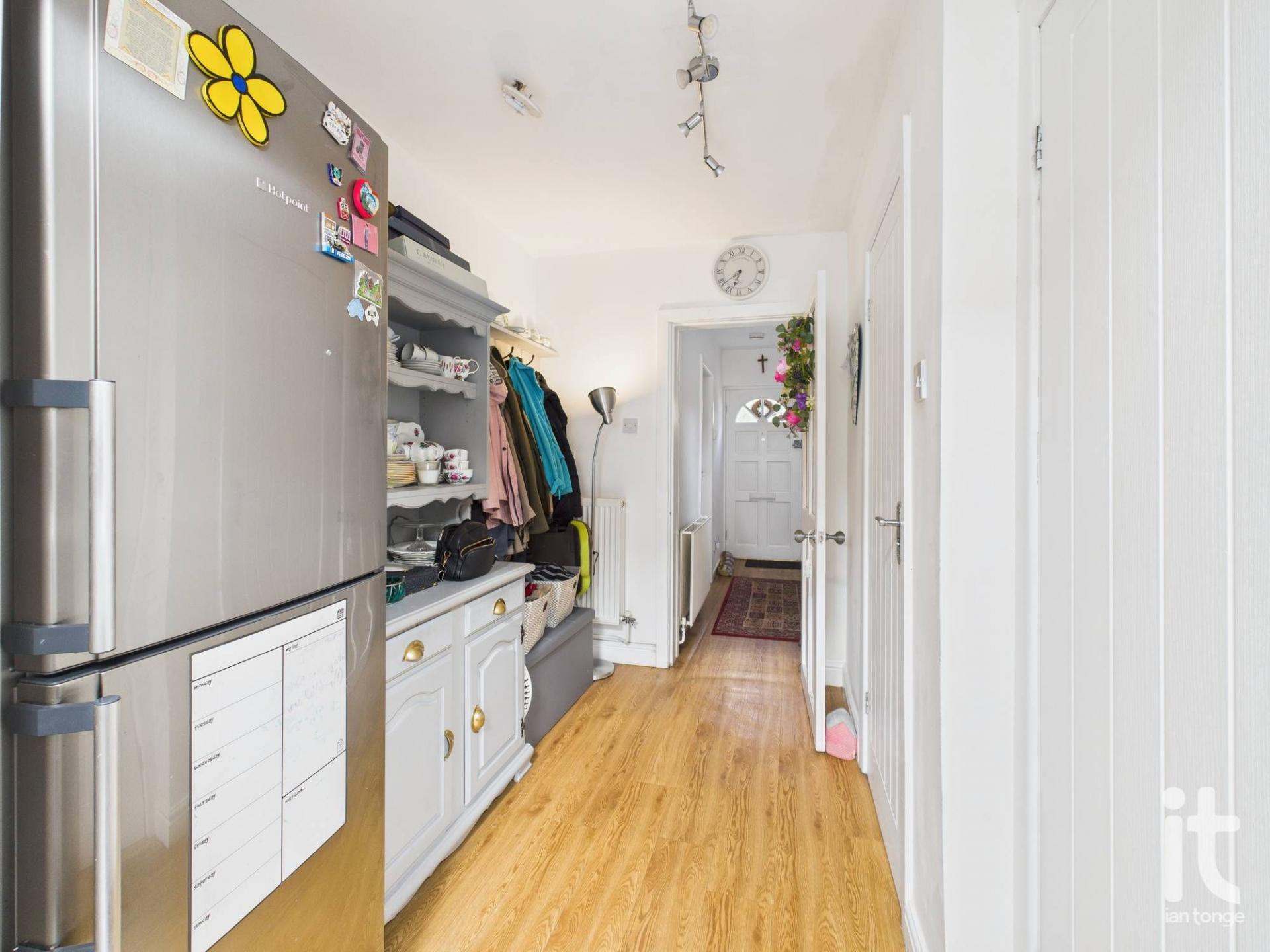 with cloakroom space, space for tall fridge//freezer, radiator, access to W.C, large pantry cupboard.