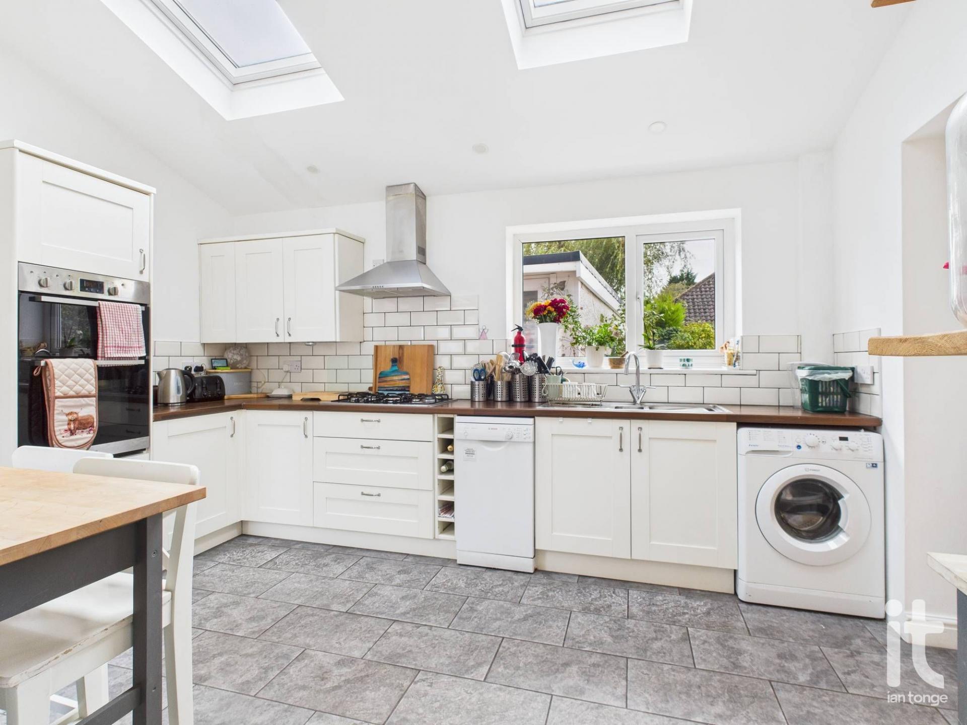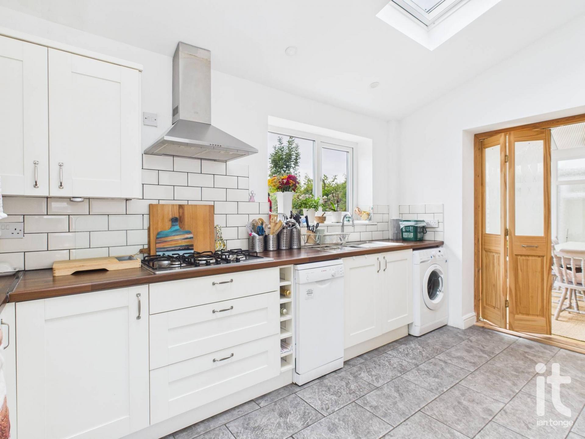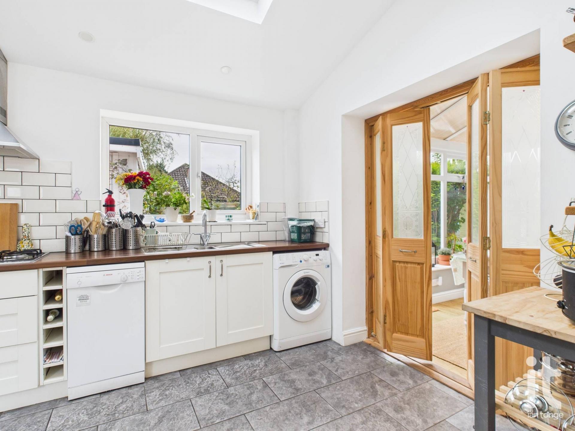uPVC double glazed window to rear aspect, two Velux to ceiling, modern fitted range of wall and base units with worksurfaces incorporating stainless steel sink and drainer, five ring gas hob with extractor canopy over. Built-in eye level electric double oven, breakfast bar, space for dishwasher, plumbing for automatic washing machine, column radiator, tiled flooring, bi-folds through to conservatory.