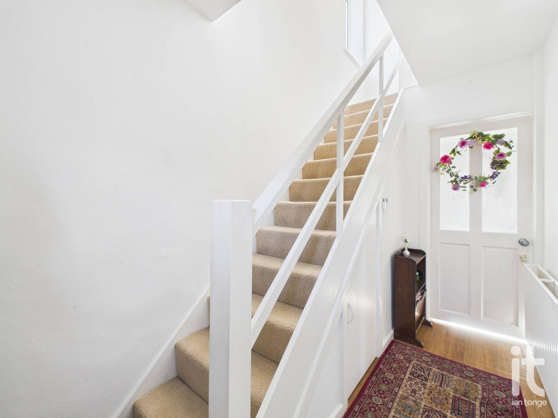 Wooden entrance door leading to hallway with stairs to first floor, understair storage cupboard, radiator.