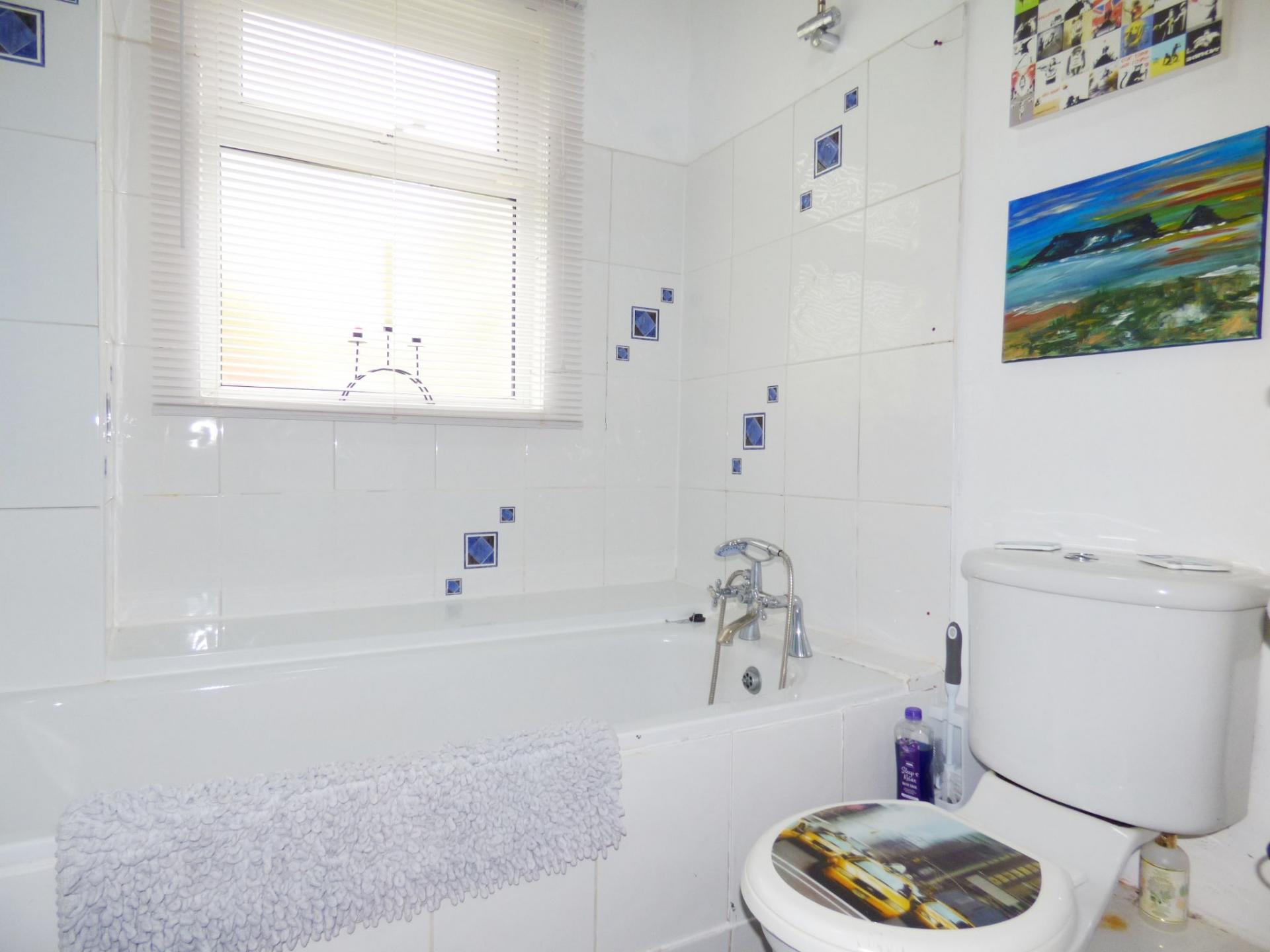 Three piece suite comprising a low level WC, pedestal hand wash basin and corner bath with shower attachment. Velux window, vinyl flooring and radiator.