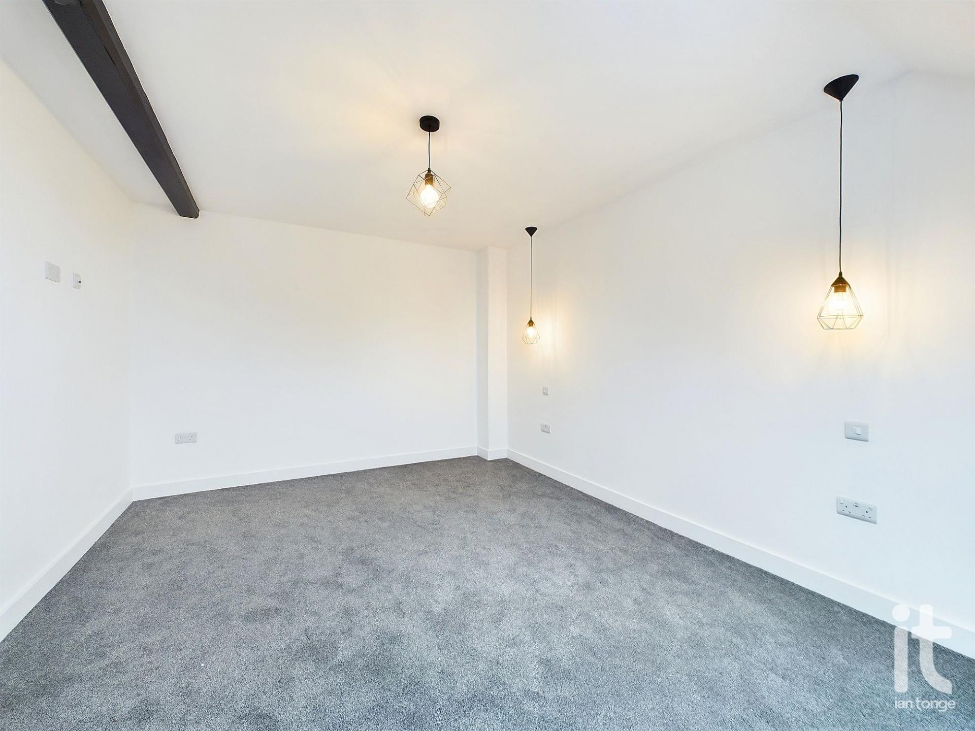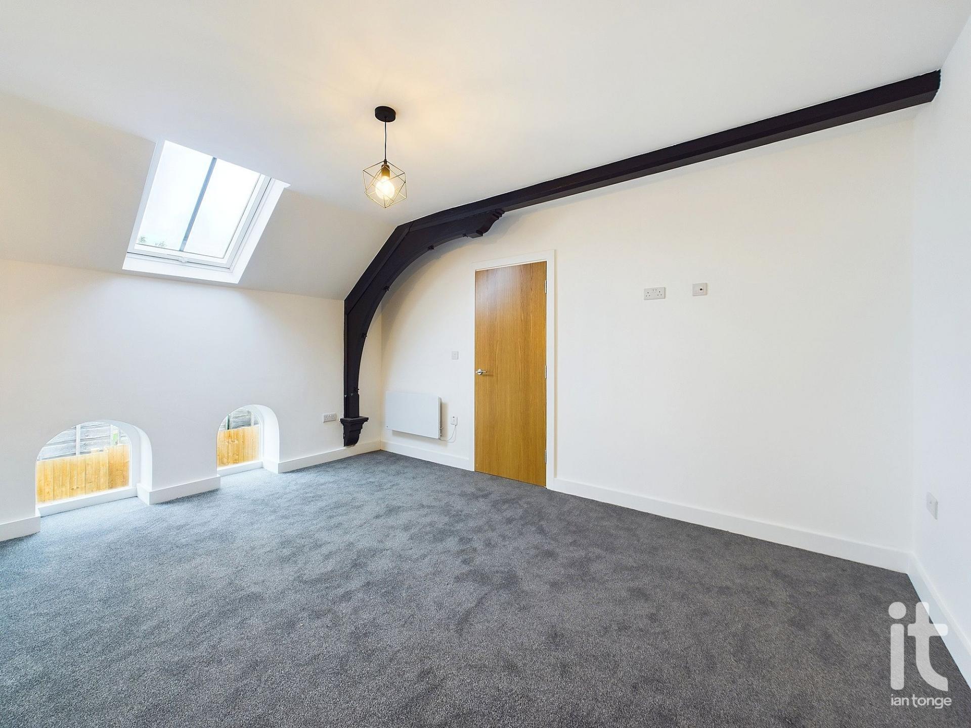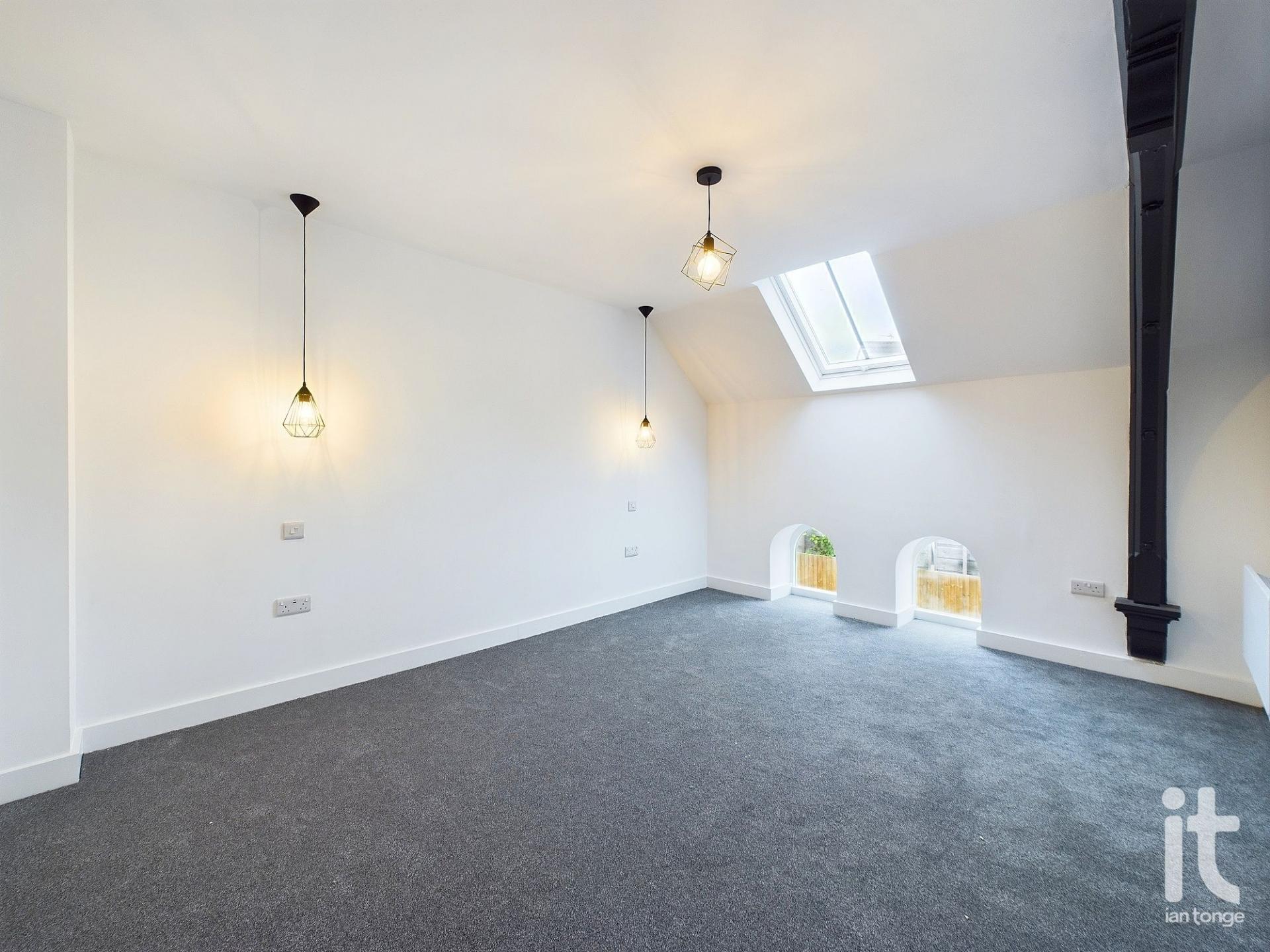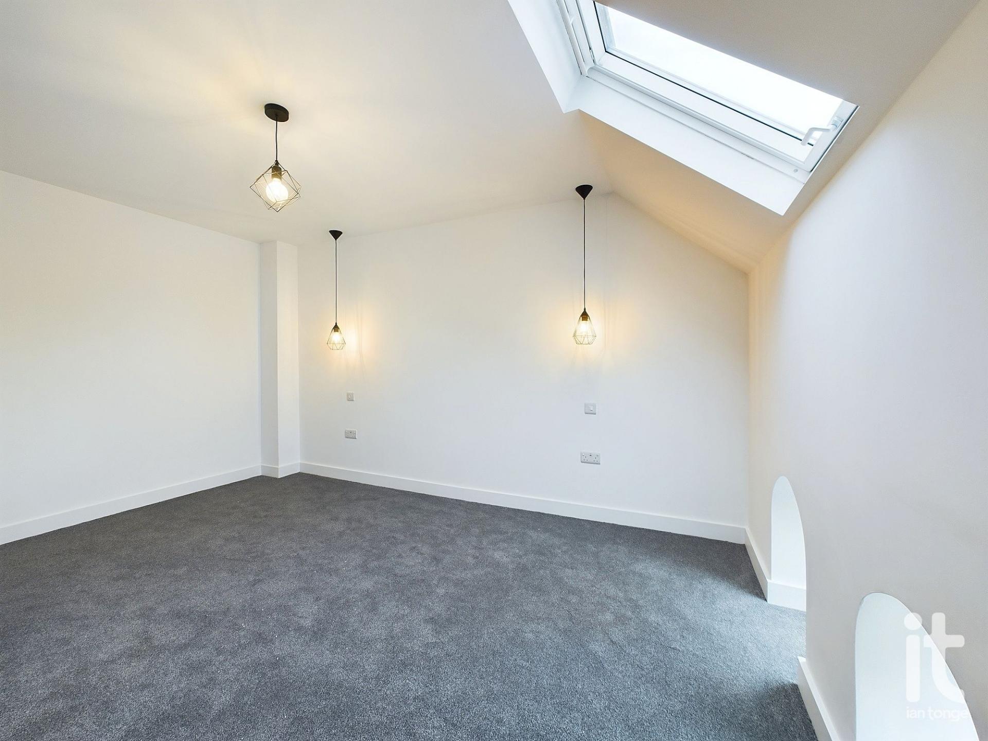 Large uPVC double glazed Velux window with small decorative uPVC double glazed window below. New carpet, electric radiator, three ceiling pendant lights and tv point.