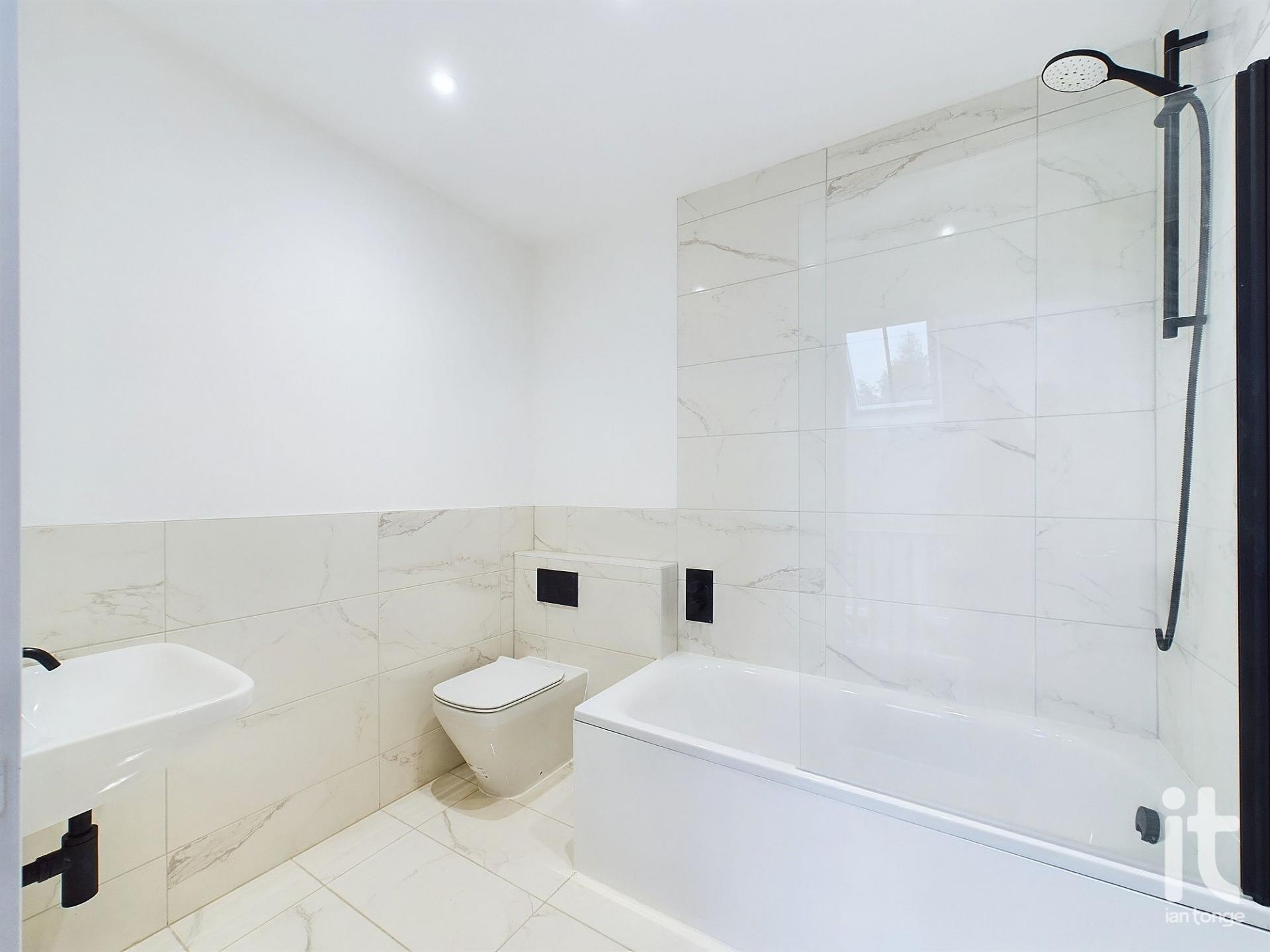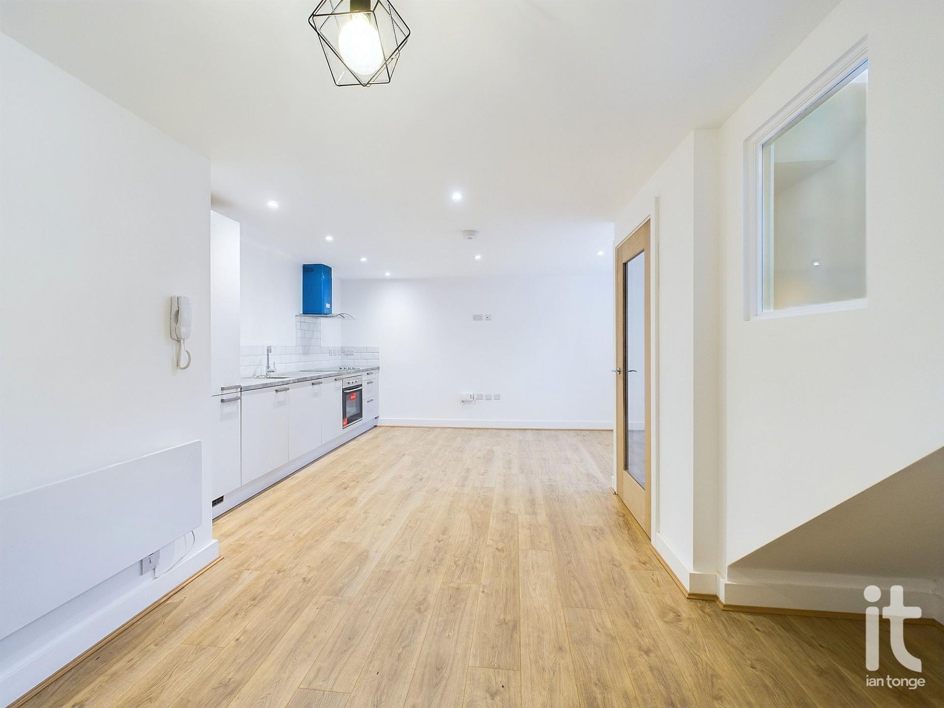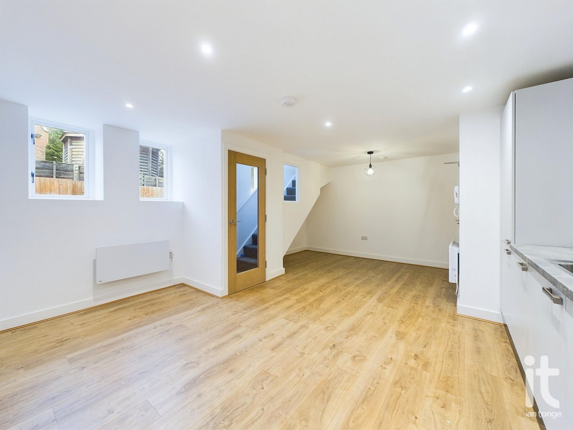 Spacious open plan room, oak effect laminate flooring, contemporary new kitchen, with pebble coloured base units and wood effect wall units. Marble effect laminate worktop, integrated fridge/freezer, washing machine, electric hob, extractor and oven. Sink, drainer and tap. Large floor to ceiling uPVC double glazed window overlooking the garden. Two electric radiators, downlights, fuse box, smoke alarm, ceiling light and open reach point.
