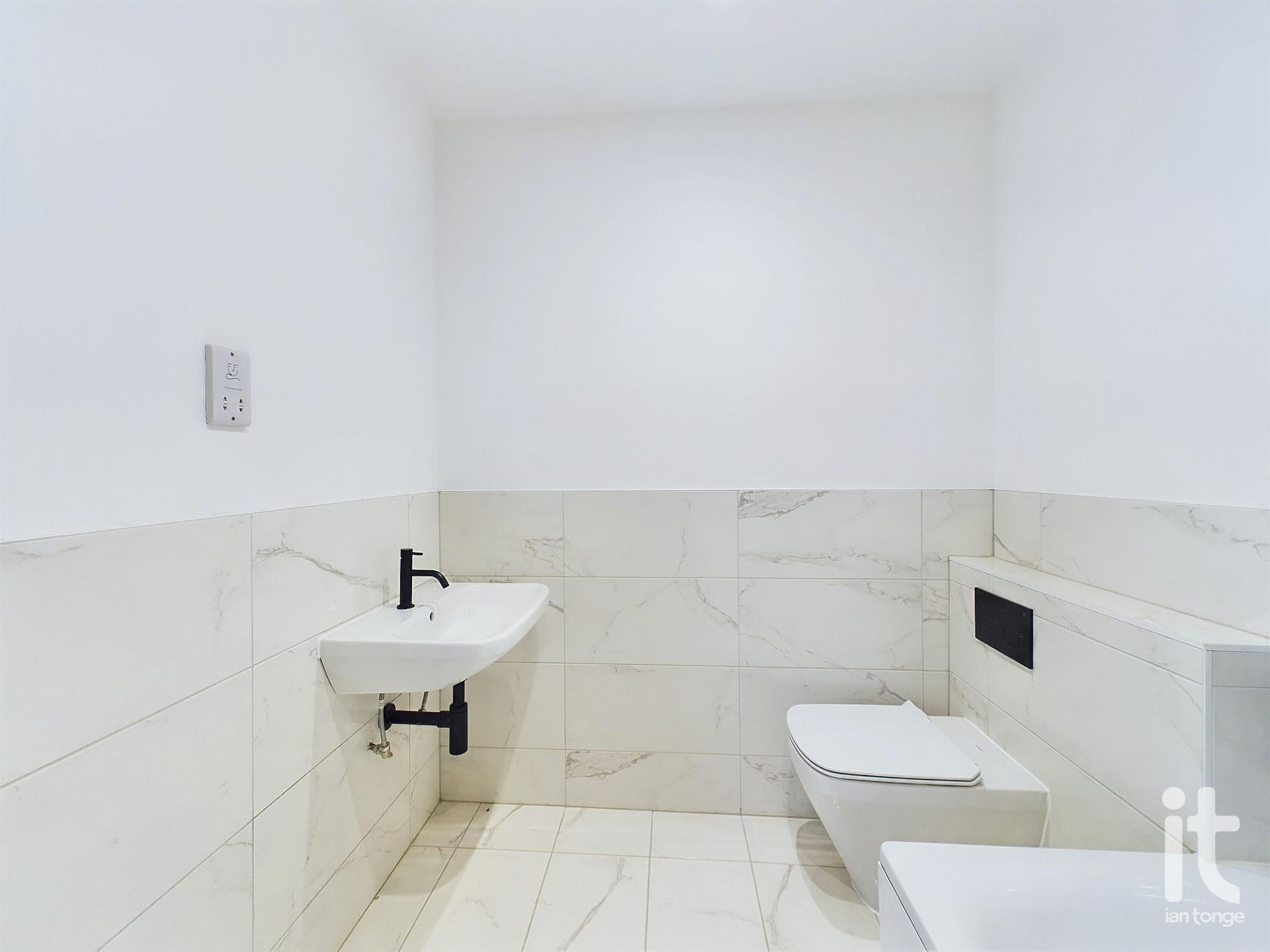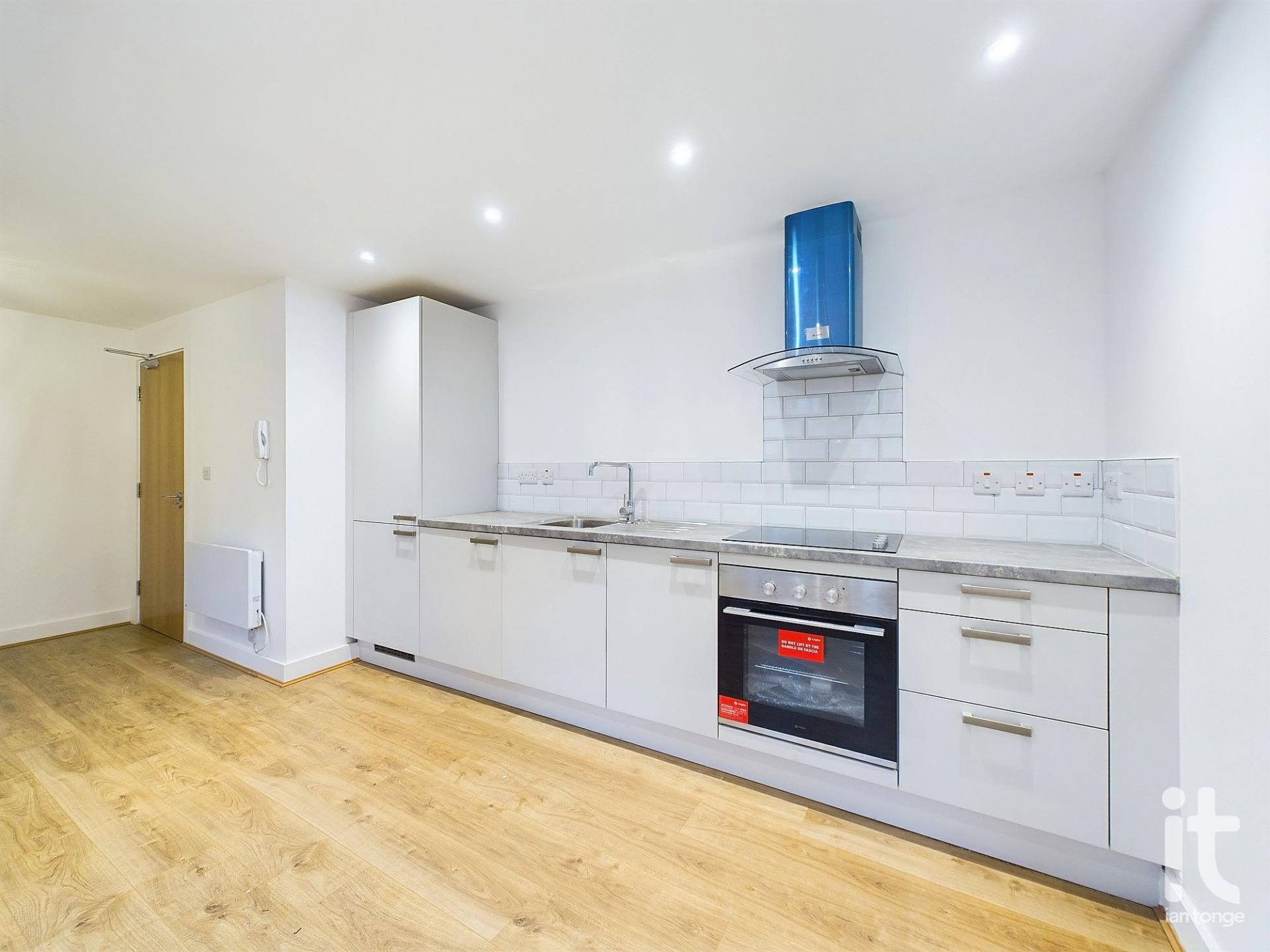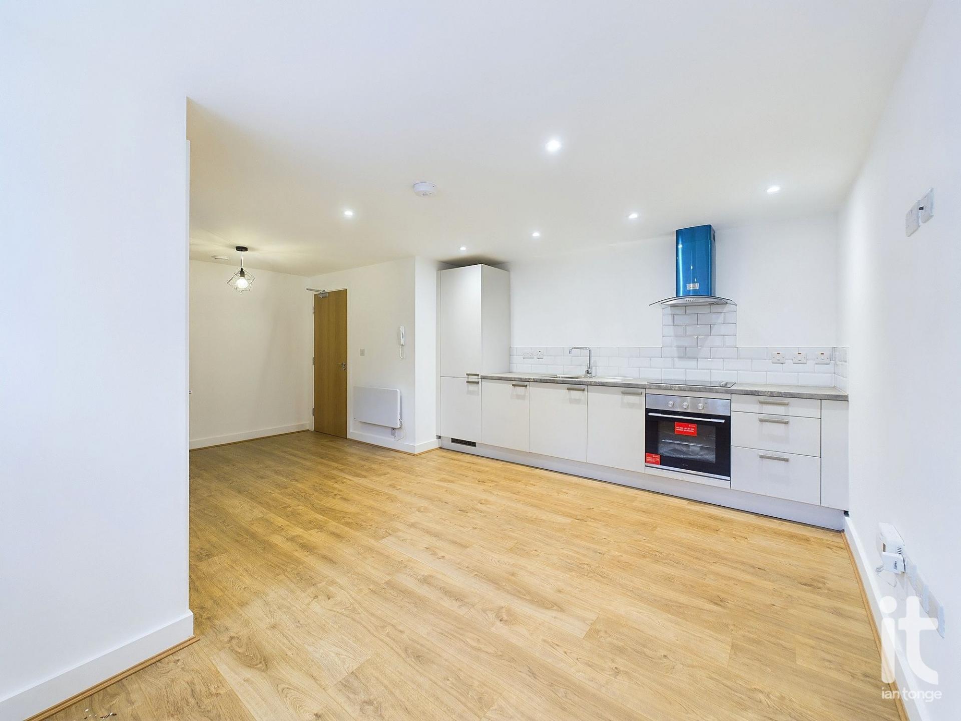 Spacious open plan room, oak effect laminate flooring, contemporary new kitchen, with pebble coloured base units and wood effect wall units. Marble effect laminate worktop, integrated fridge/freezer, washing machine, electric hob, extractor and oven. Sink, drainer and tap. Large floor to ceiling uPVC double glazed window overlooking the garden. Two electric radiators, downlights, fuse box, smoke alarm, ceiling light and open reach point.