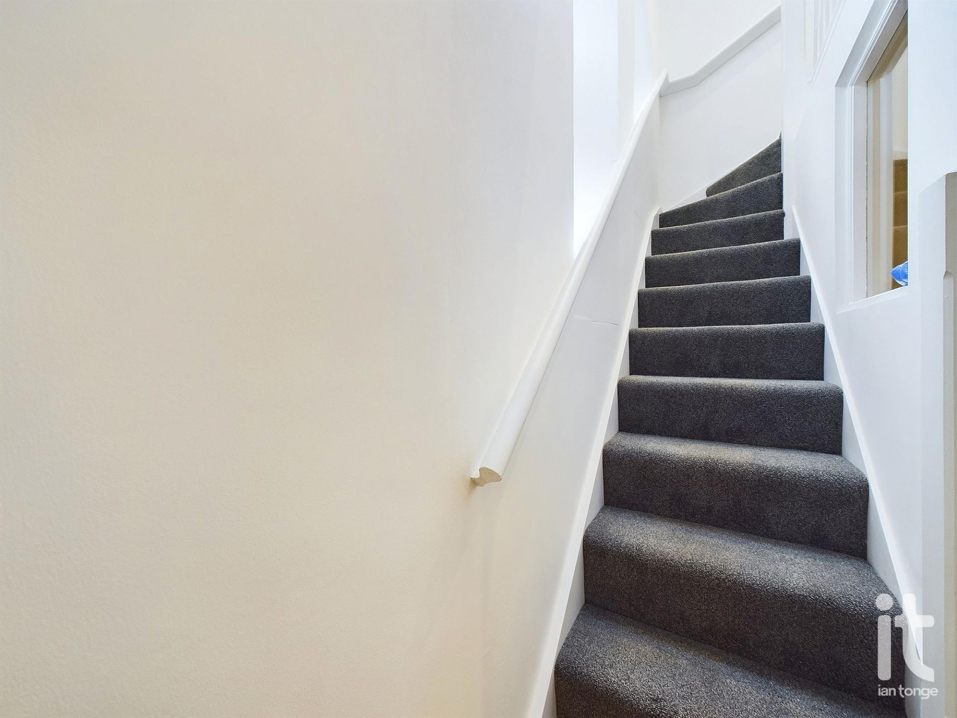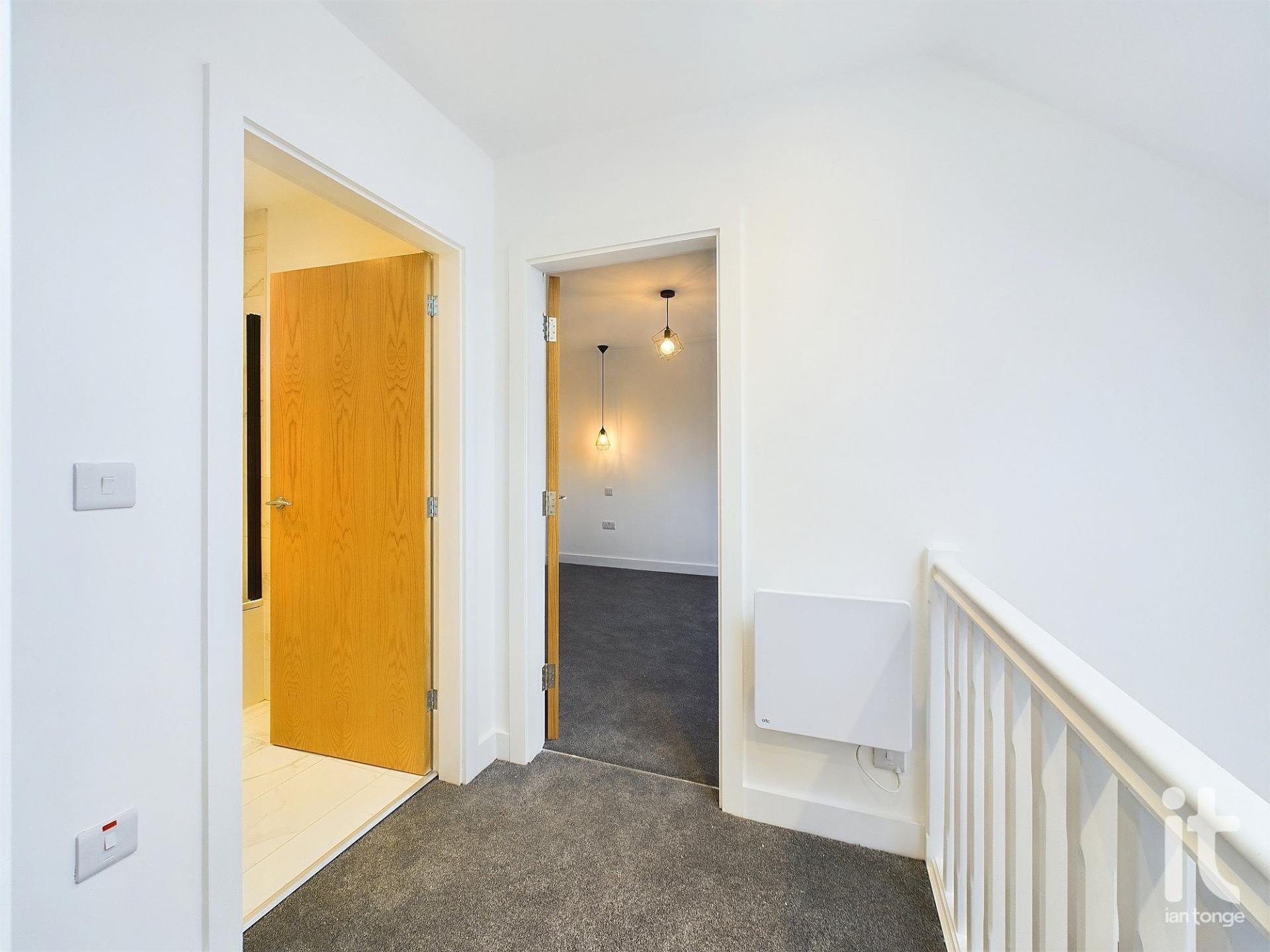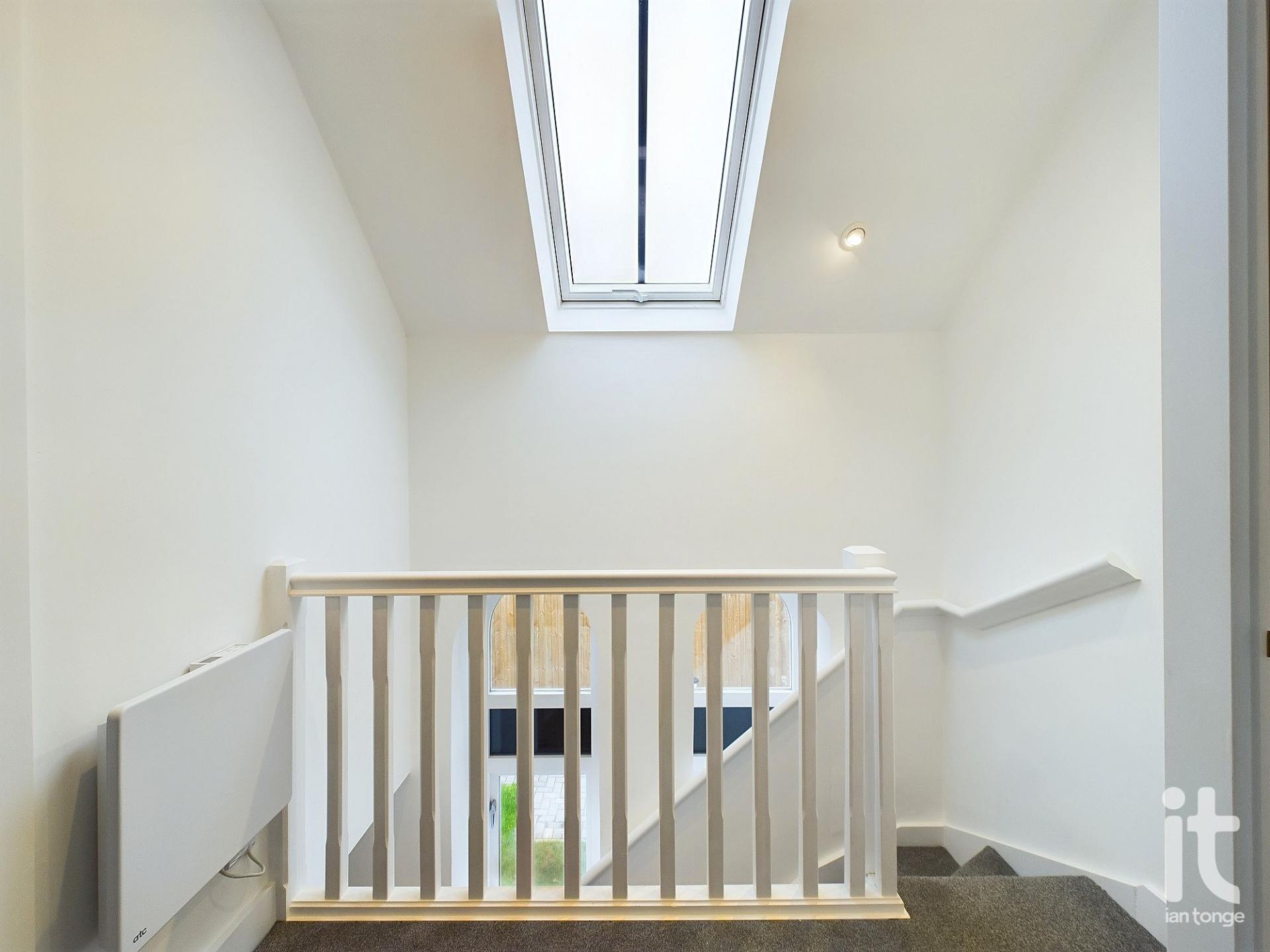 Wooden white banister, large uPVC double glazed Velux window, decorative smaller uPVC double glazed window. New carpet, electric radiator, smoke alarm, loft hatch, doors leading into the bedroom and bathroom.