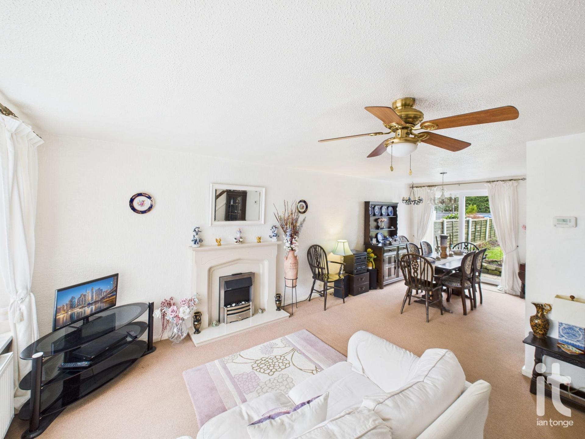 uPVC double glazed window to front aspect, feature fireplace with electric fire, two radiators, open-plan staircase, uPVC double glazed patio doors leading to garden.