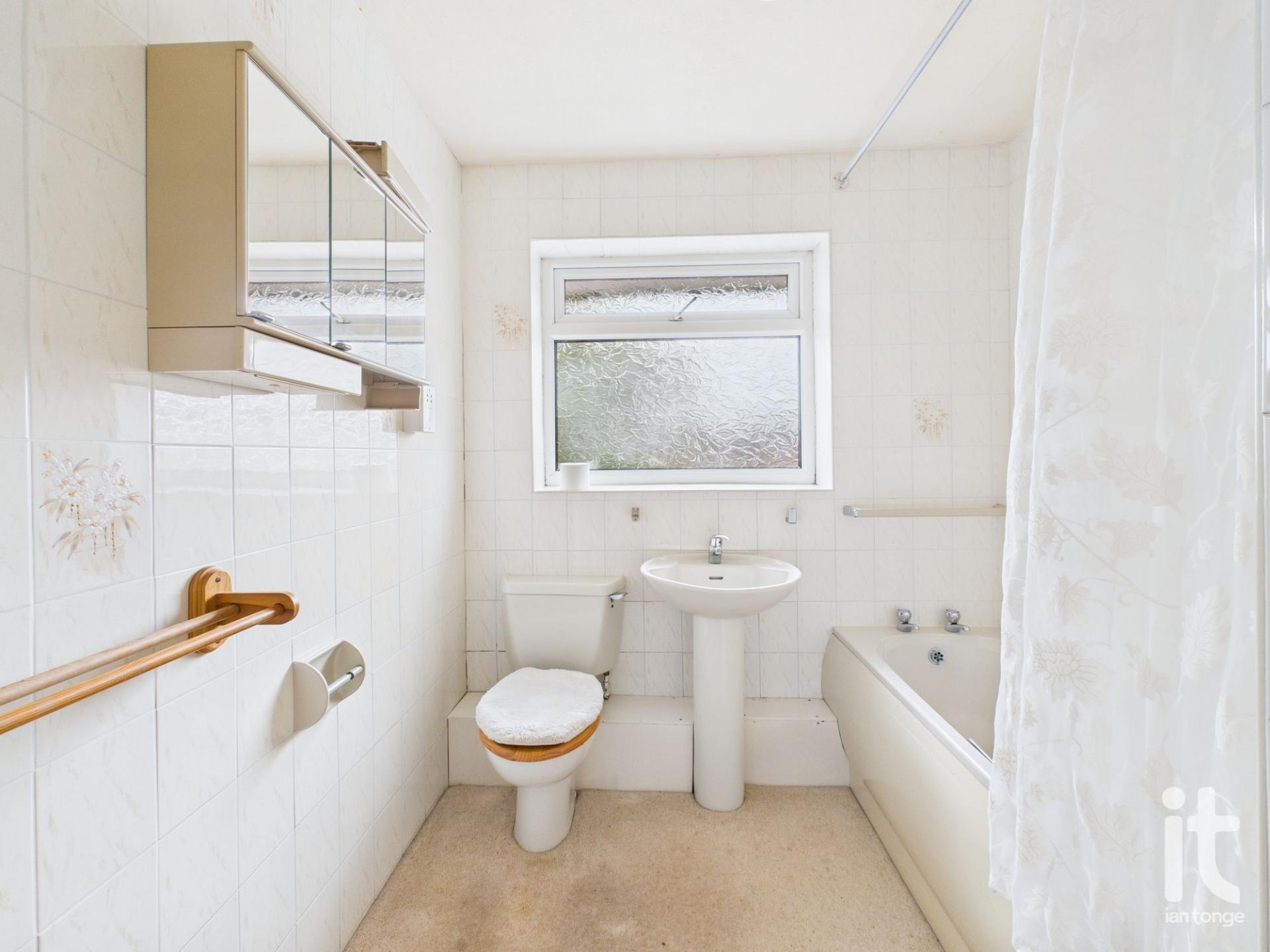 uPVC double glazed window to the rear aspect, panel bath with Mira shower over, pedestal wash basin, low level W.C., tiled walls, shaver point.