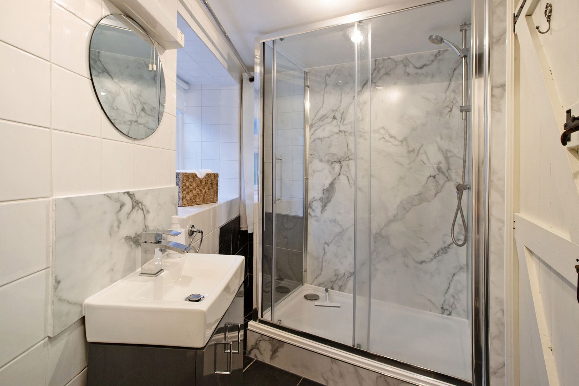 SHOWER ROOM: A white suite comprising double walk-in enclosure with thermostatic shower over and glass sliding door. Close coupled WC, wash hand basin with vanity storage under, radiator, shaver point and tiled walls. Shaver point, tiled flooring and uPVC double glazed window to the front aspect.