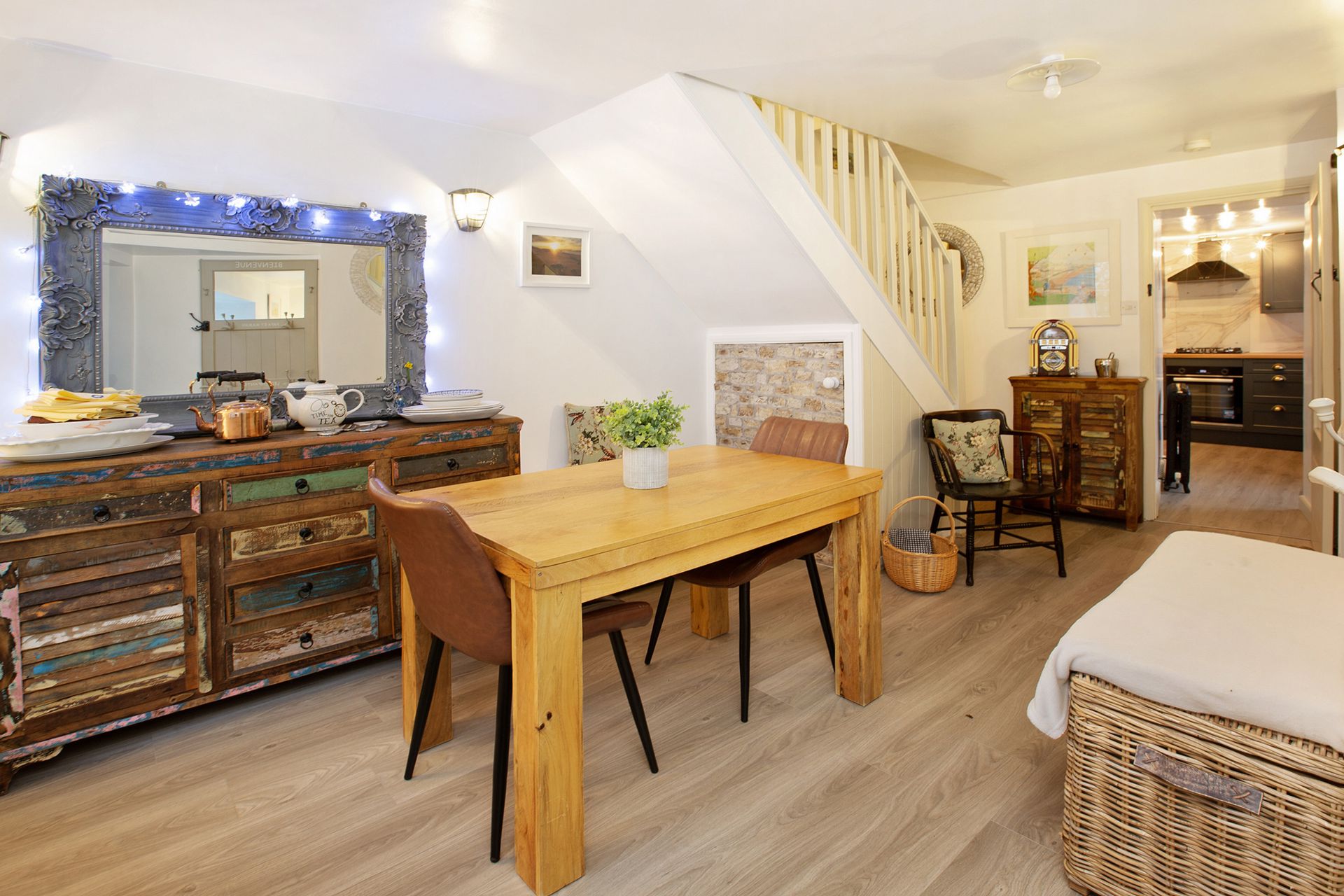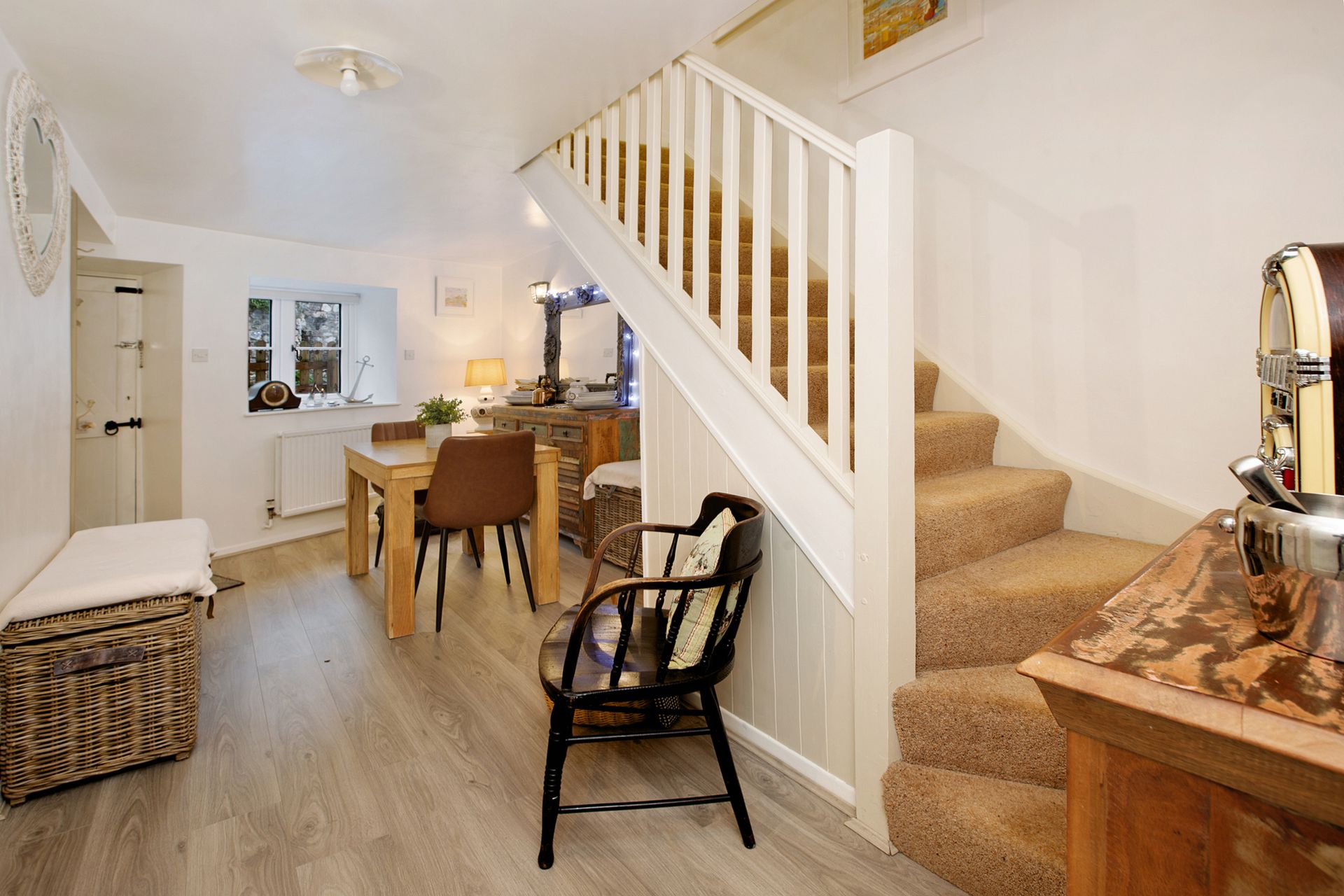 DINING ROOM: 4.91m x 3.48m (16'1" x 11'5"), Deep sill uPVC double glazed window to the front aspect, two radiators, wall lights and stairs leading to the first-floor landing. Laminate flooring, under stairs storage cupboard and glazed door to ...