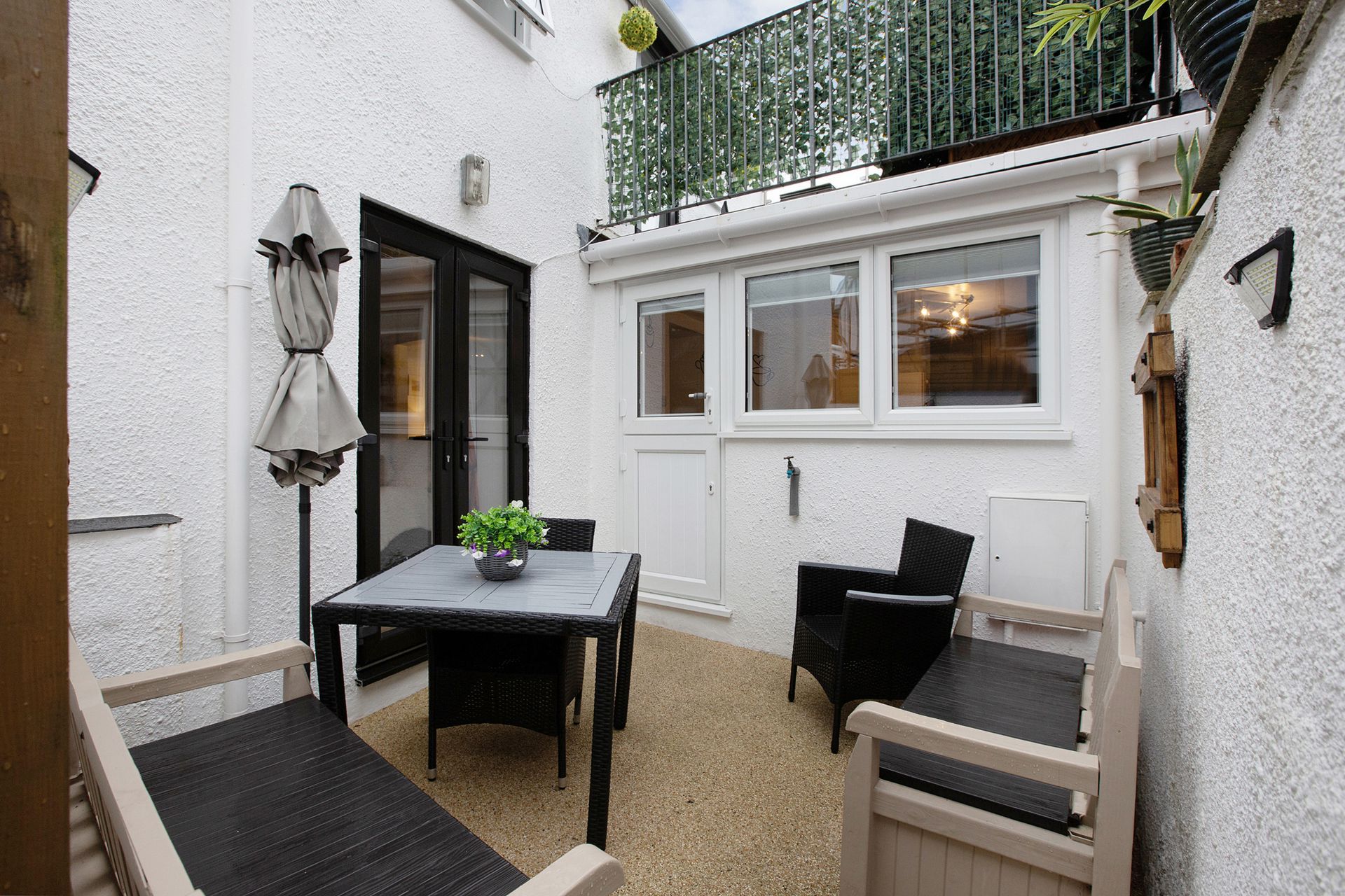 OUTSIDE: To the front of the property there is a resin base parking area and steps leading to the front door with open porch. The enclosed resin base courtyard garden benefits outside tap, lighting and garden gate providing rear access to a level walk towards the town centre.