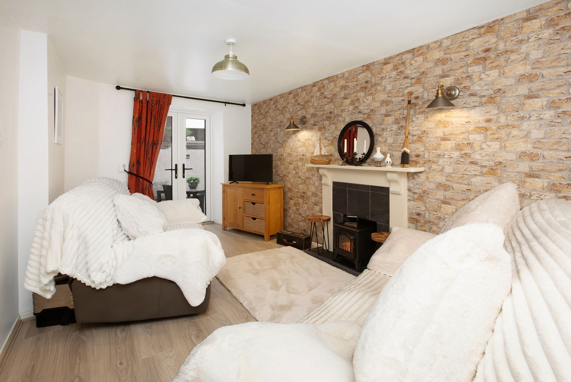 SITTING ROOM: 4.40m x 2.66m (14'5" x 8'9") MAX, A cosy sitting room with deep sill uPVC double glazed window to the front aspect, two radiators, feature fireplace with electric fire, slate surround and hearth. uPVC double glazed doors opening out to the enclosed courtyard garden, wall lights and a continuation of laminate flooring.