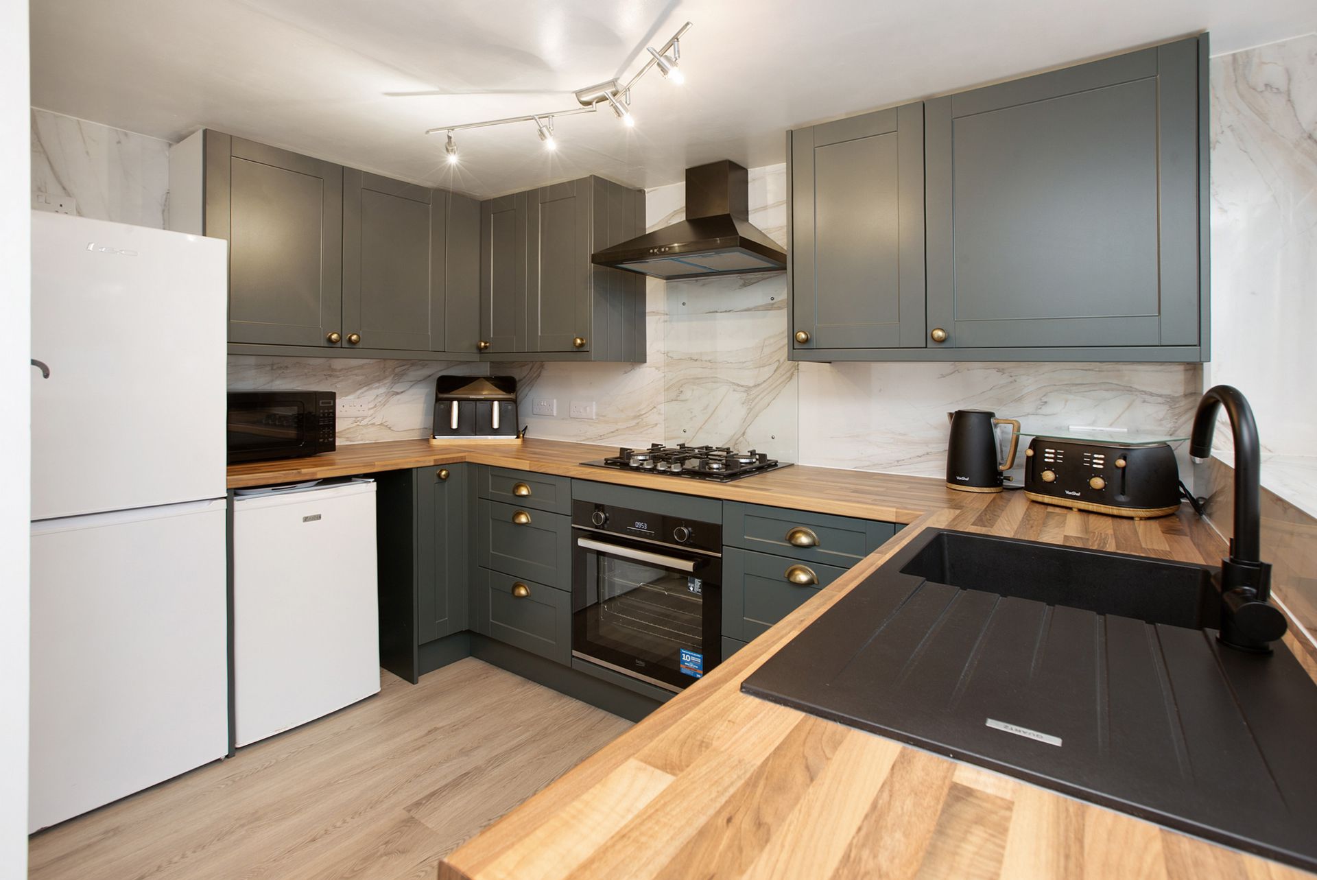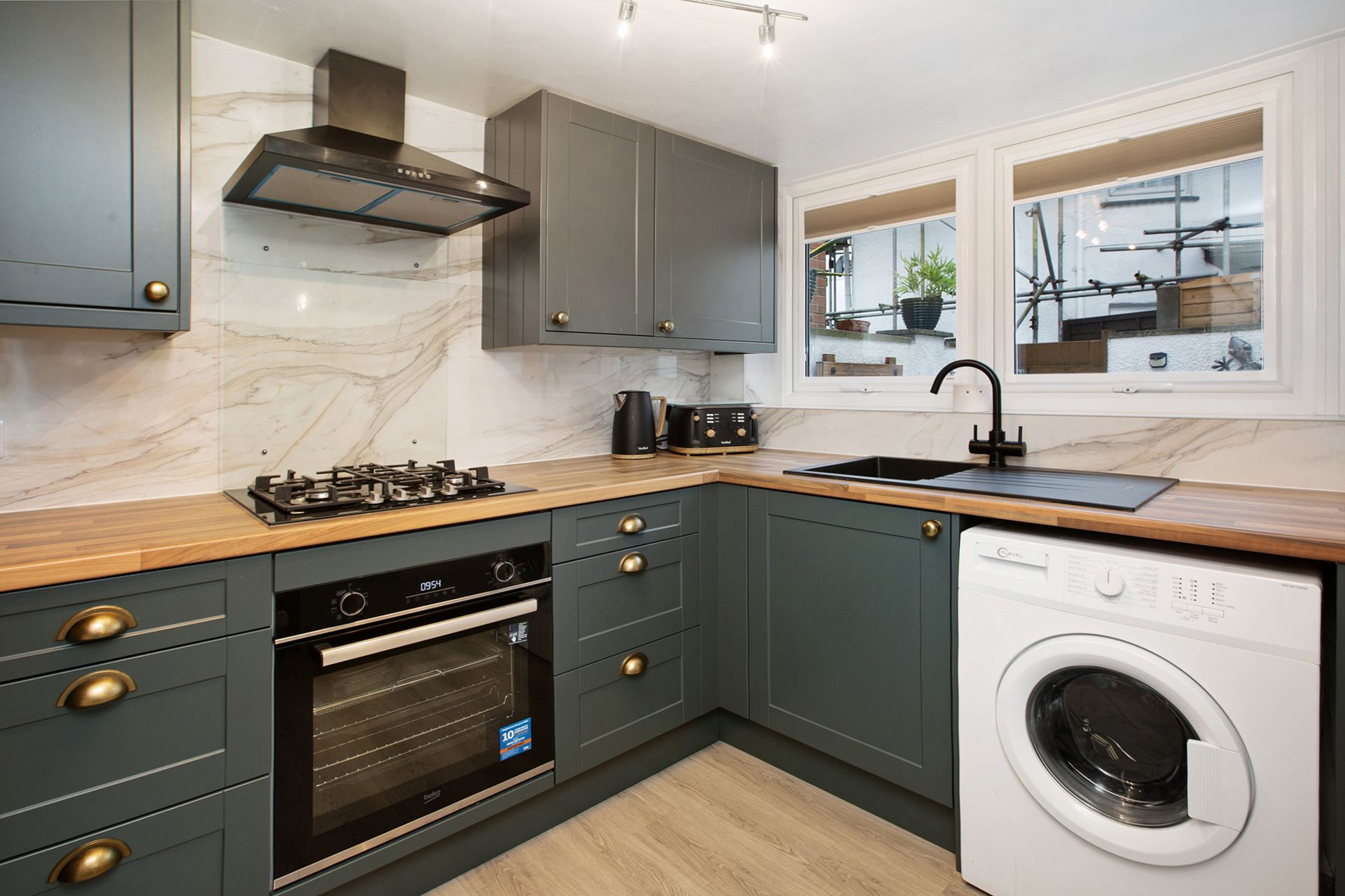 KITCHEN: 2.94m x 2.90m (9'8" x 9'6") MAX, This modern shaker style kitchen comprises eye level and base units with roll top work surfaces over, black composite sink and drainer with mixer taps, integrated oven with gas hob and extractor over. Space and plumbing for washing machine, tumble dryer and fridge/freezer. uPVC double glazed windows and stable door overlooking the courtyard garden, feature radiator and a continuation of laminate flooring. Door to...