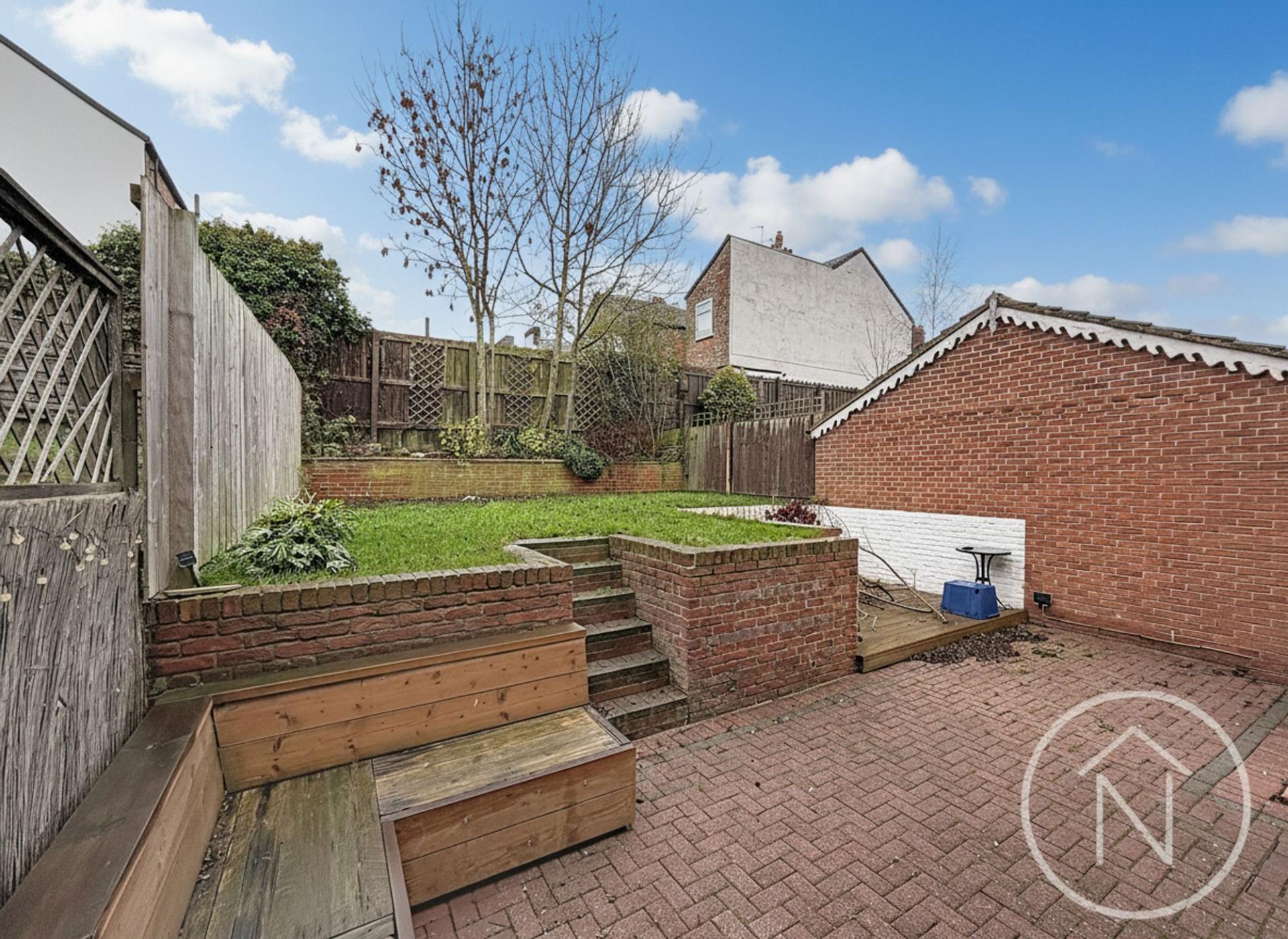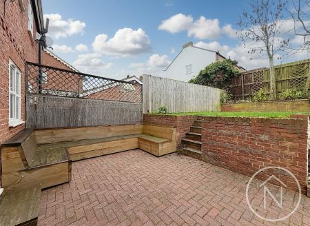 The property excels with its outdoor spaces, offering a multi-level landscaped garden that provides both functionality and privacy. The brick patio with built-in wooden seating is ideal for relaxing or entertaining, while the elevated grassy area and privacy fencing create a secluded environment for family gatherings or peaceful enjoyment. The brick exterior and double-glazed windows enhance the home's classic and durable design, while the front garden and off-road parking add further convenience and kerb appeal.