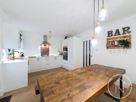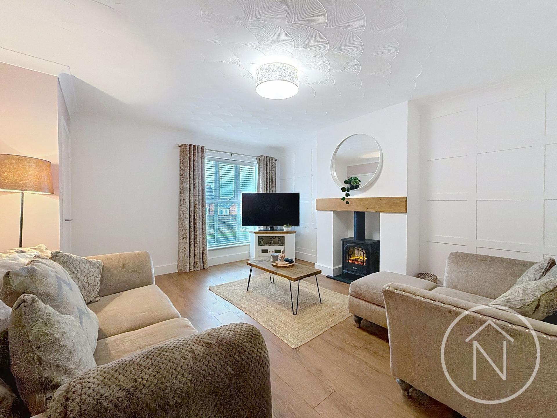 This beautifully presented three-bedroom semi-detached house offers a harmonious blend of modern style and practical family living. The property welcomes you with a neat front garden and convenient off-road parking, ensuring easy access and great kerb appeal. Inside, the spacious living room exudes warmth and character, featuring decorative panelling, modern flooring and a large window that fills the space with natural light. The heart of the home is the contemporary kitchen, boasting sleek white cabinetry, integrated appliances, a striking backsplash, and illuminated by decorative pendant lighting.