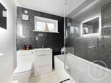 Upstairs, the three generously sized bedrooms are designed with comfort and versatility in mind. The main bedroom enjoys a large window, plush carpeting, modern decor, offering a cosy retreat. The modern family bathroom impresses with its sleek design, including a bath with shower over, integrated storage, an illuminated mirror, and contemporary fixtures.