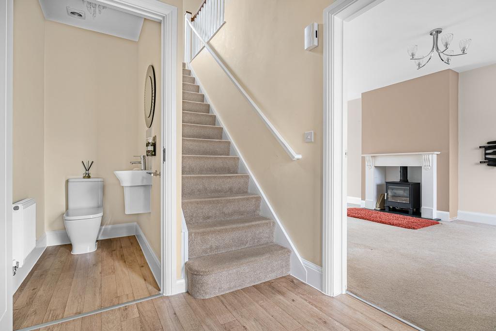 The entrance hall with cloakroom leads off to the left through to a generous kitchen/dining with integrated appliances, a separate utility room provides space for a washing machine and tumble dryer. To the right of the hallway is the sitting room which has a feature fireplace with multi-fuel burner, this room leads to a conservatory which flows out to the landscaped garden. Upstairs is the family bathroom and four good sized bedrooms, the master having an en-suite shower room.