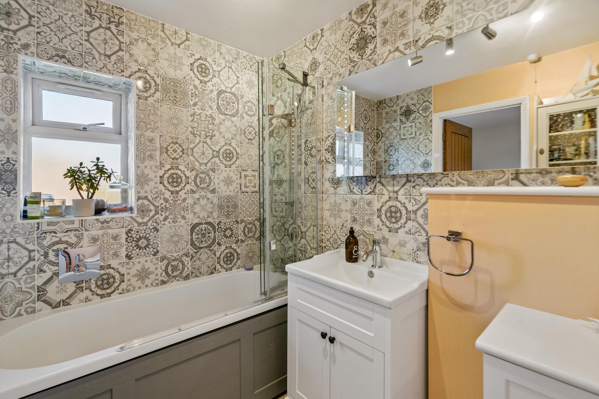 Family Bathroom comprising a panelled bath with mixer taps and over bath shower and screen, inset wash hand basin with storage below, WC and tiled walls,
