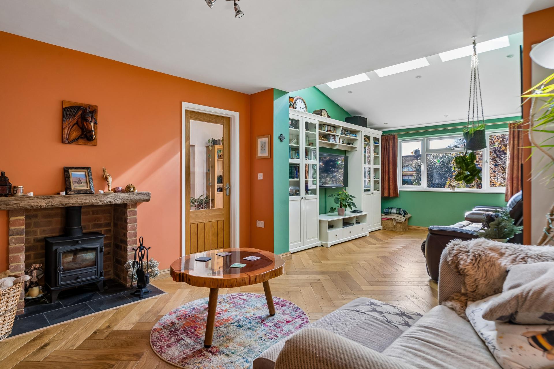 Large Living Room /Family Room with fireplace with log burning stove, herringbone wooden flooring, Velux style skylights and an aspect over the Rear Garden.