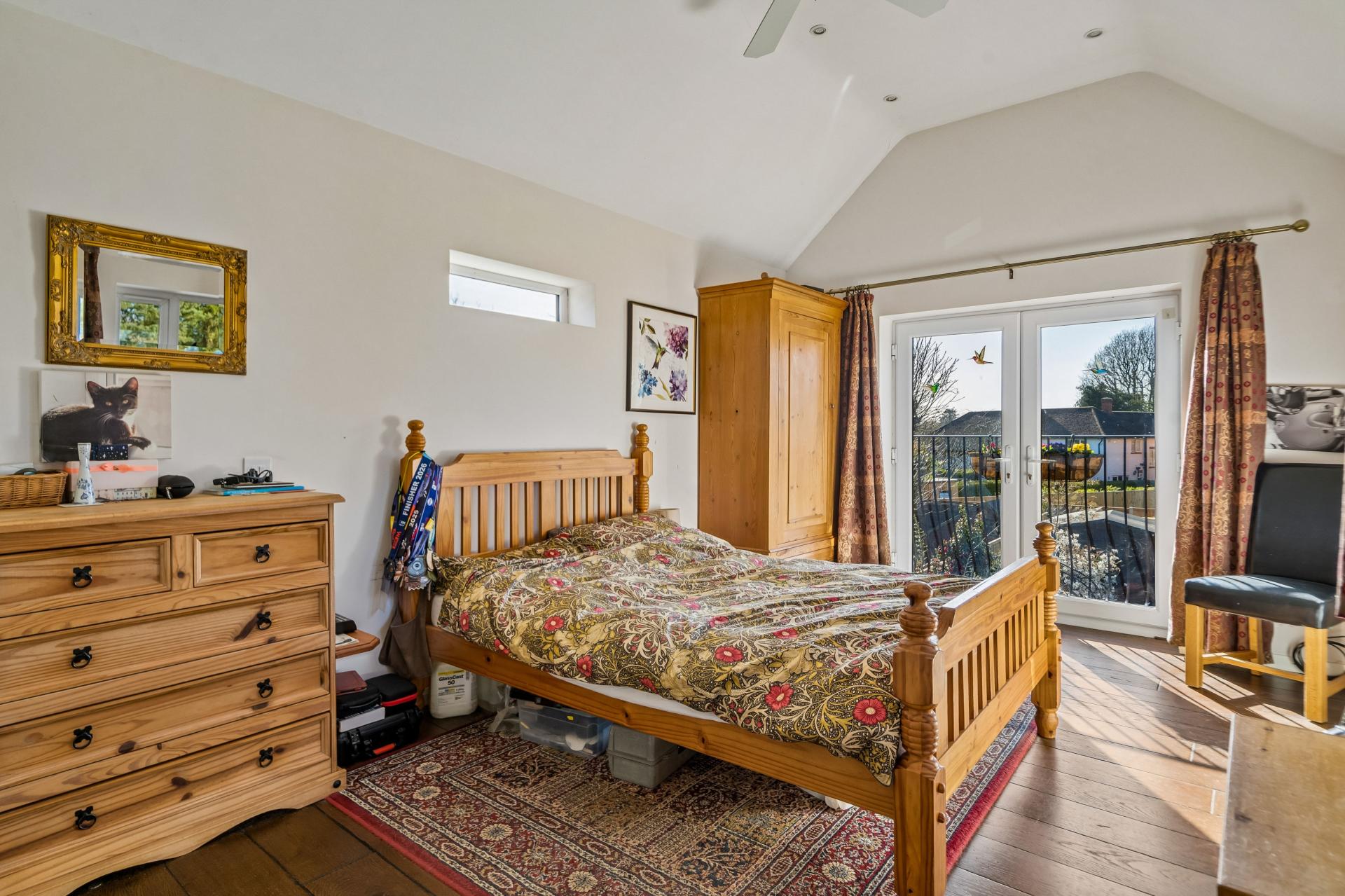 Bedroom One with good ceiling heights and double doors over looking Rear Garden with safety balcony, range of built in wardrobe cupboards. En Suite Shower Room comprising of a large walk in double shower, inset twin wash hand basins with storage below, WC with encased cistern, tiled flooring and part tiled walls.