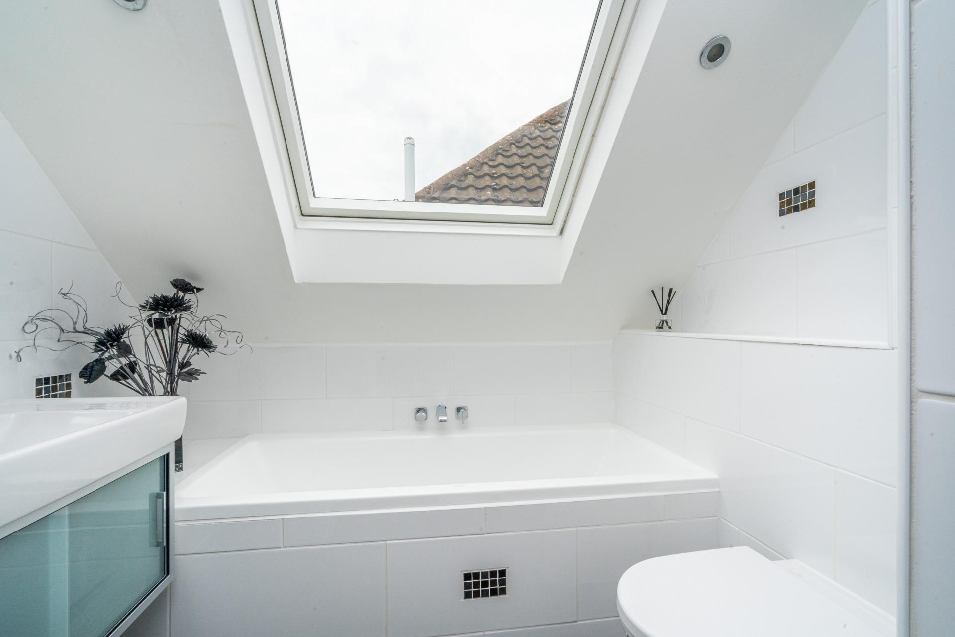 Upstairs, the landing with loft hatch and skylight has doors to all rooms. The Primary Bedroom Suite has a large fitted wardrobe cupboard and eaves storage, the En Suite has a fully enclosed shower cubicle, heated towel rail, step down to the sink with vanity unit, low level w.c and panel enclosed bath. Bedroom Two has a recess for a wardrobe and overlooks the front, Bedroom Three overlooks the rear and Bedroom Four has a front aspect and mirror fronted wardrobe with sliding door and shelving to the side.