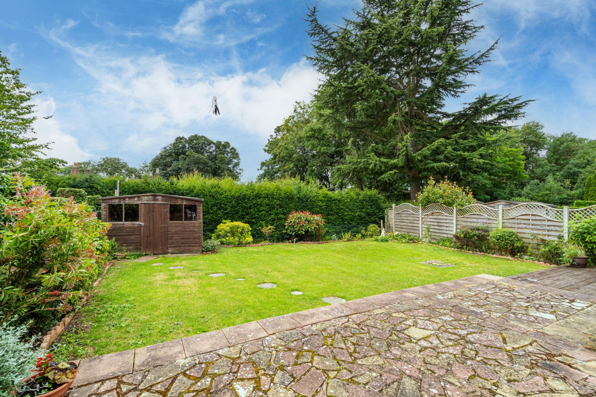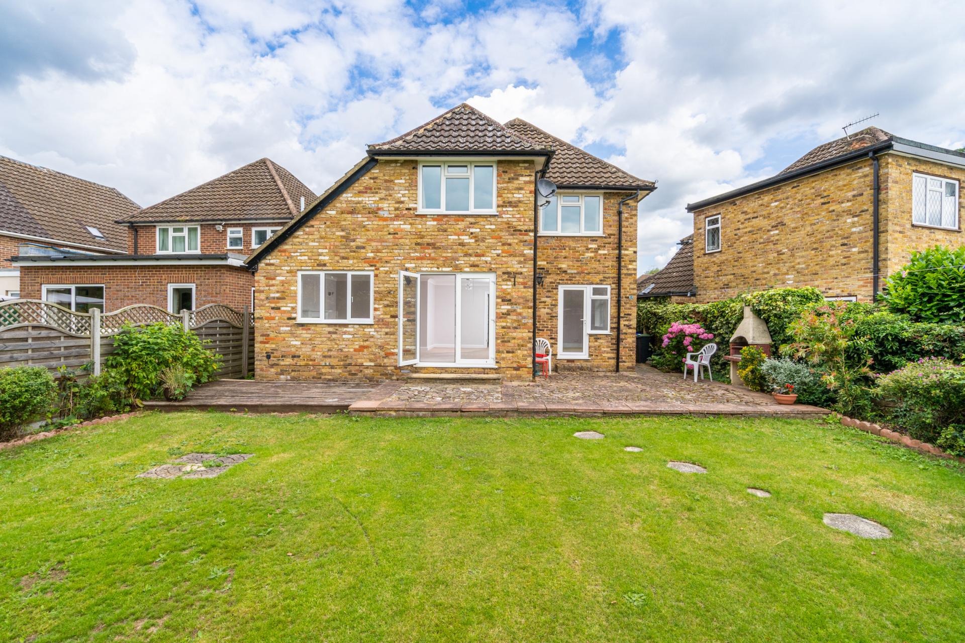 To the rear of the property, the south facing garden has been well maintained by the current owners and offers privacy and seclusion. It is enclosed by panel fencing and mature shrubs and features a large patio/seating area/deck which sweeps across the back of the house leading to a brick built BBQ and to the side access, stepping stones lead across the level lawn to the good size shed.