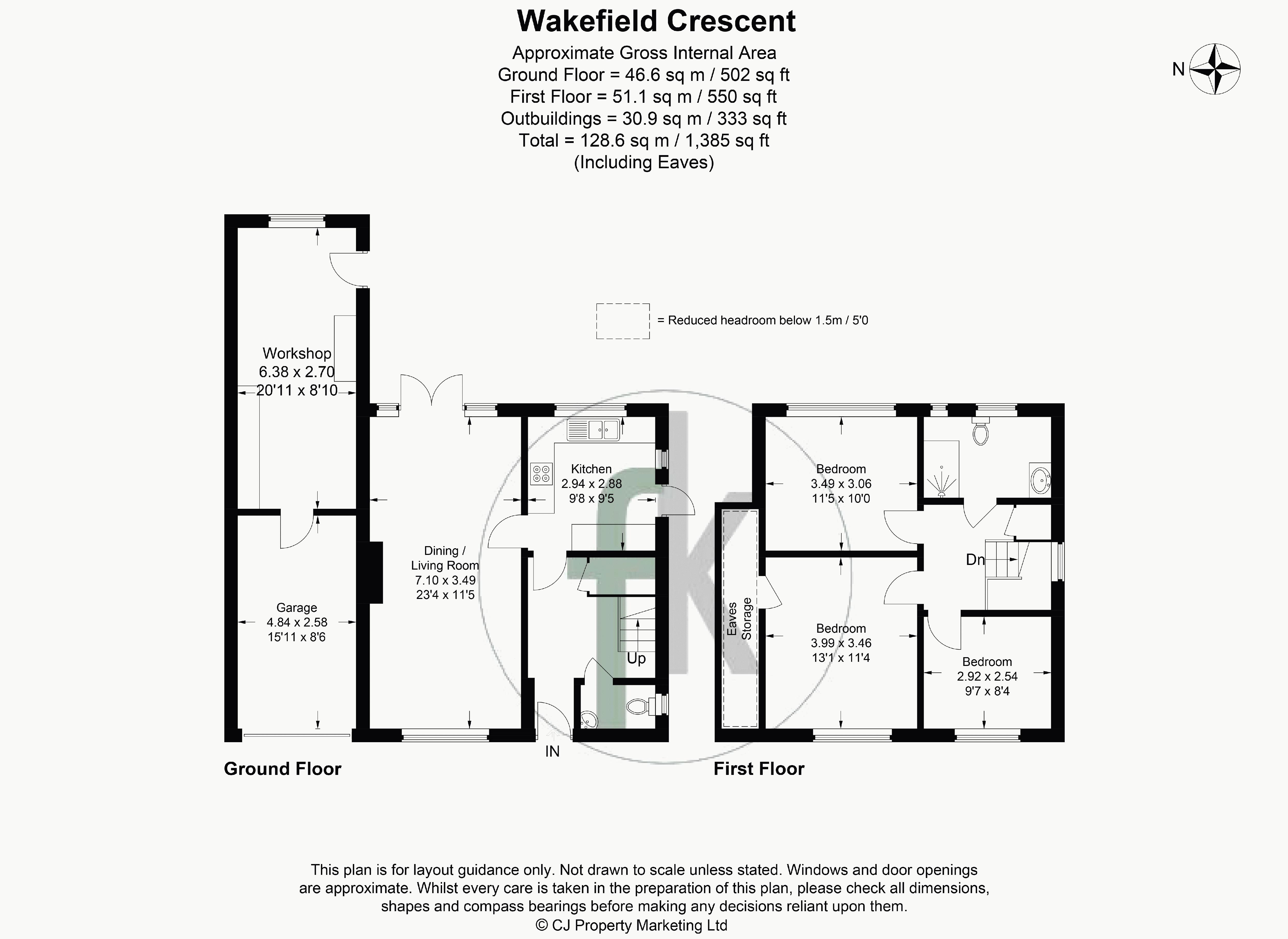 Bedroom One (front facing) with door leading to large eaves storage area, Bedroom Two (rear facing), Bedroom Three (front facing).