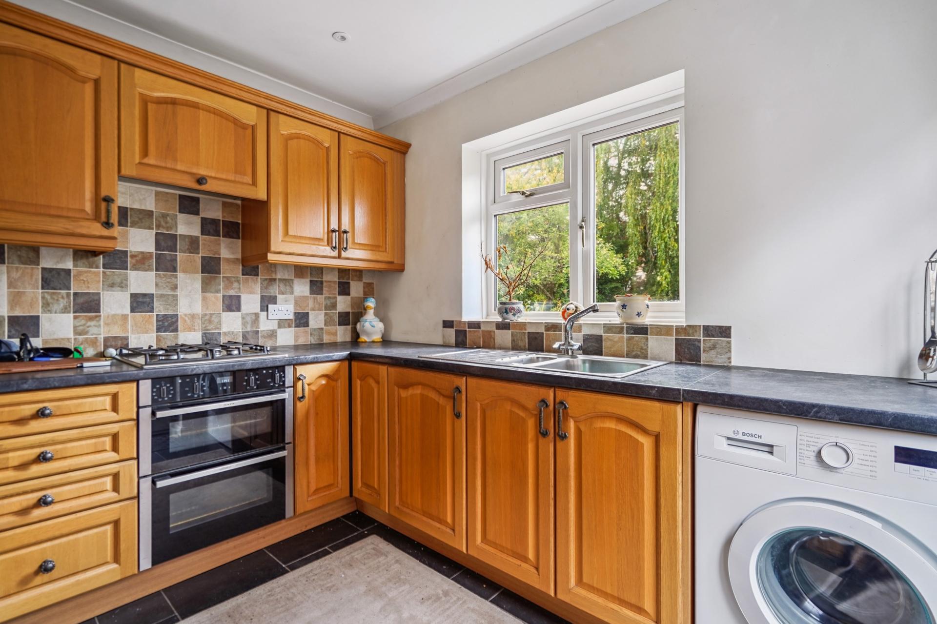 Kitchen fitted with a range of wall and base units with ample worktop surfaces, integrated gas hob and oven, space and plumbing for washing machine, stainless steel one and a half bowl sink with drainer, window with Garden aspect, tiled splashbacks and door to side access.