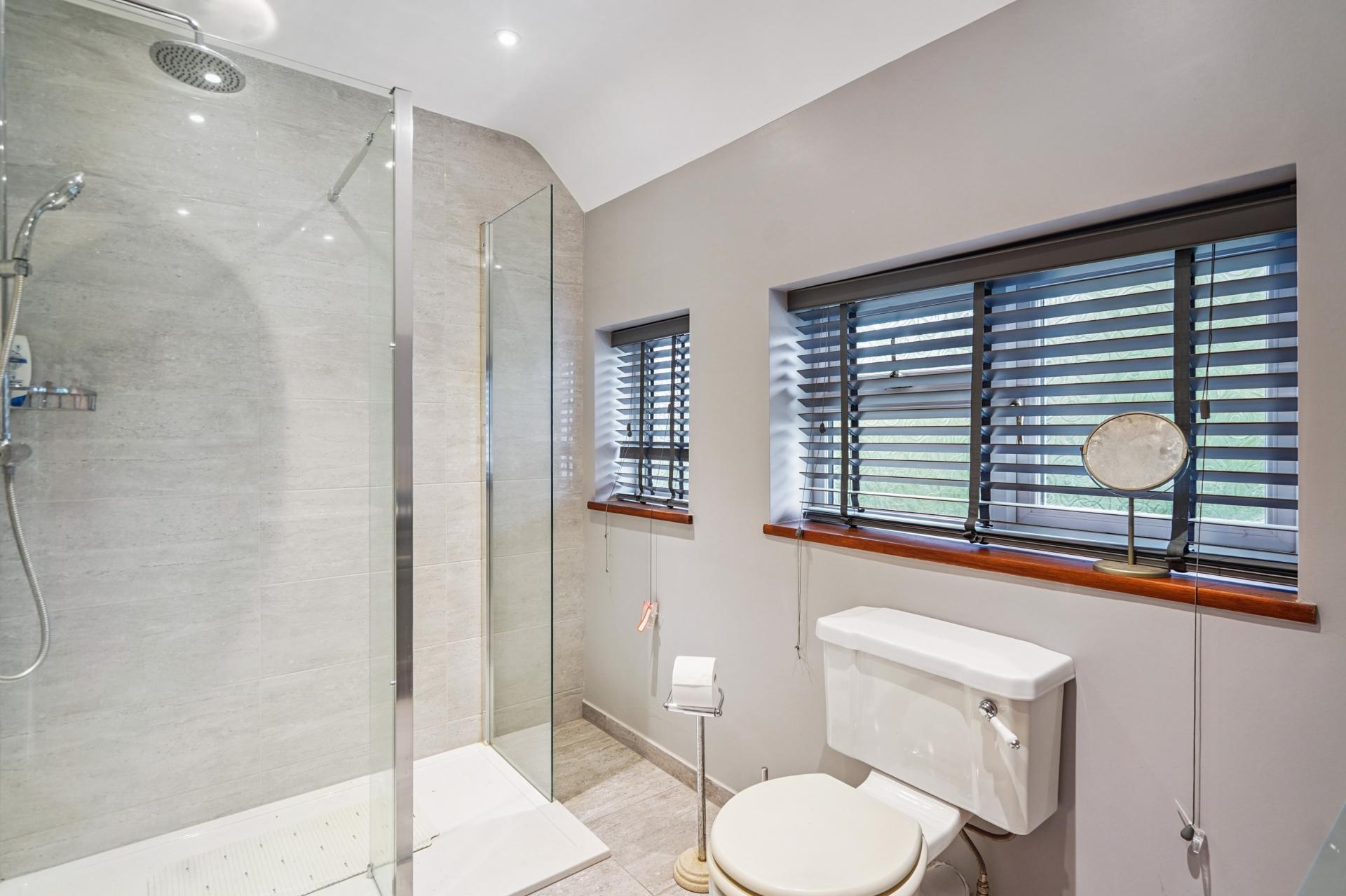 Shower Room comprising a large walk in shower cubicle, WC, inset wash hand basin with storage below, part tiled walls, window.