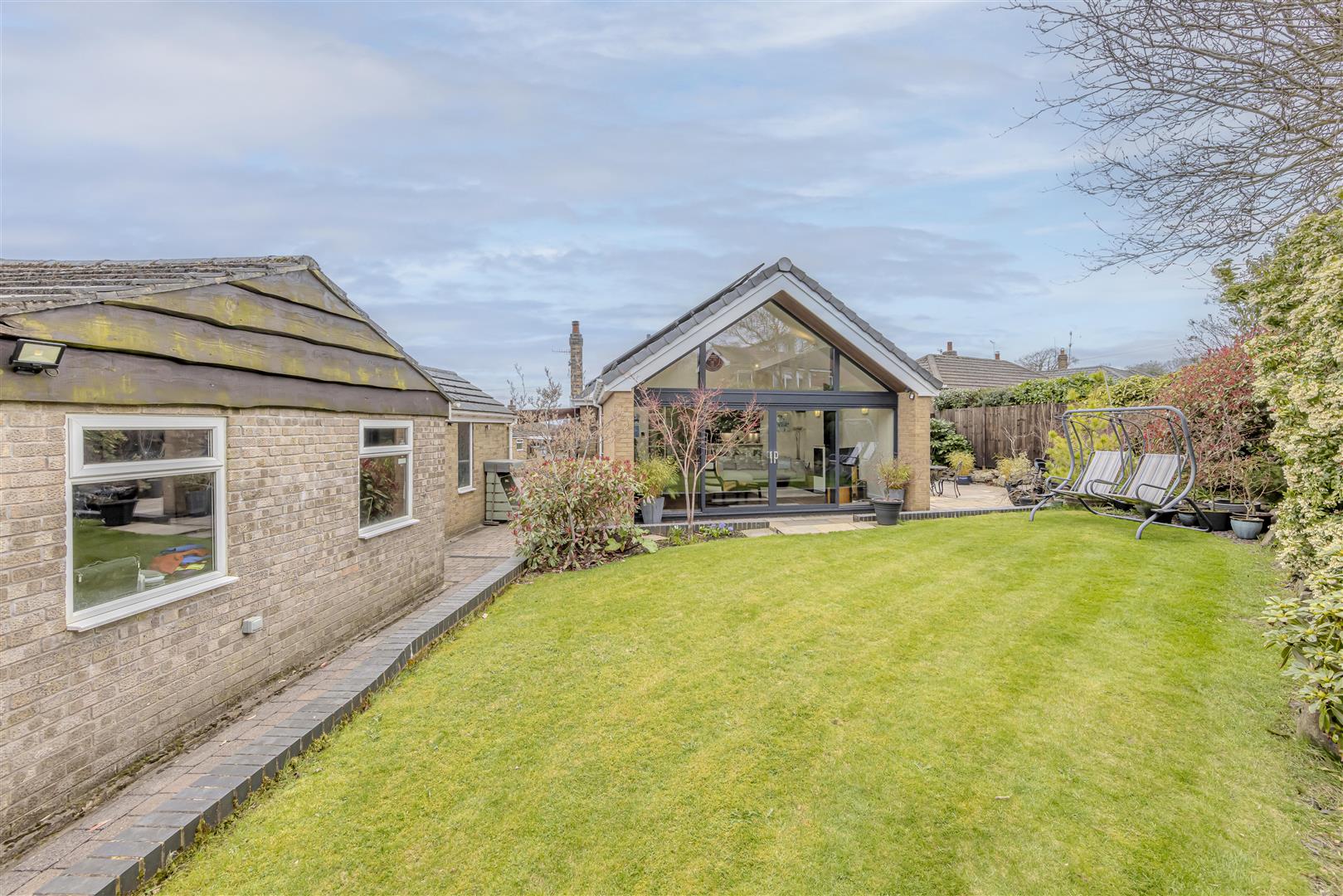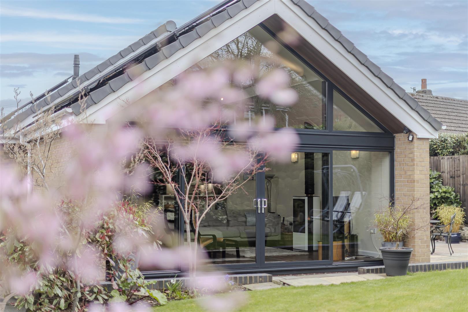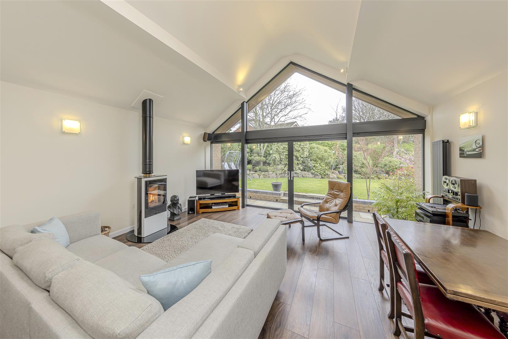 - Vaulted ceilings and full-height glazing overlooking the garden