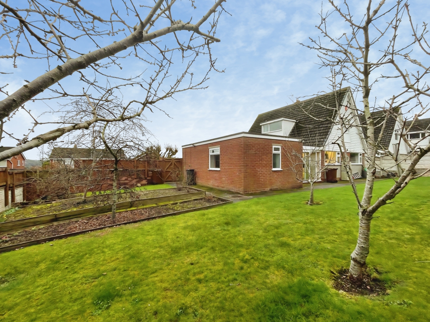 - Substantial enclosed rear garden with lawn, raised beds and fruit trees