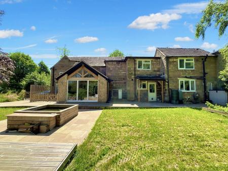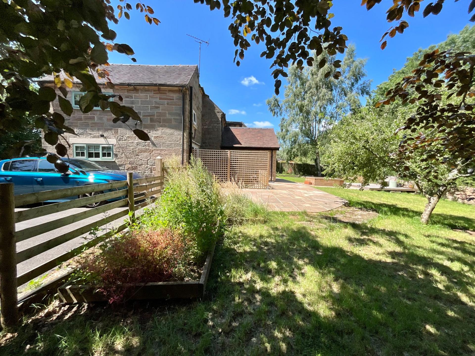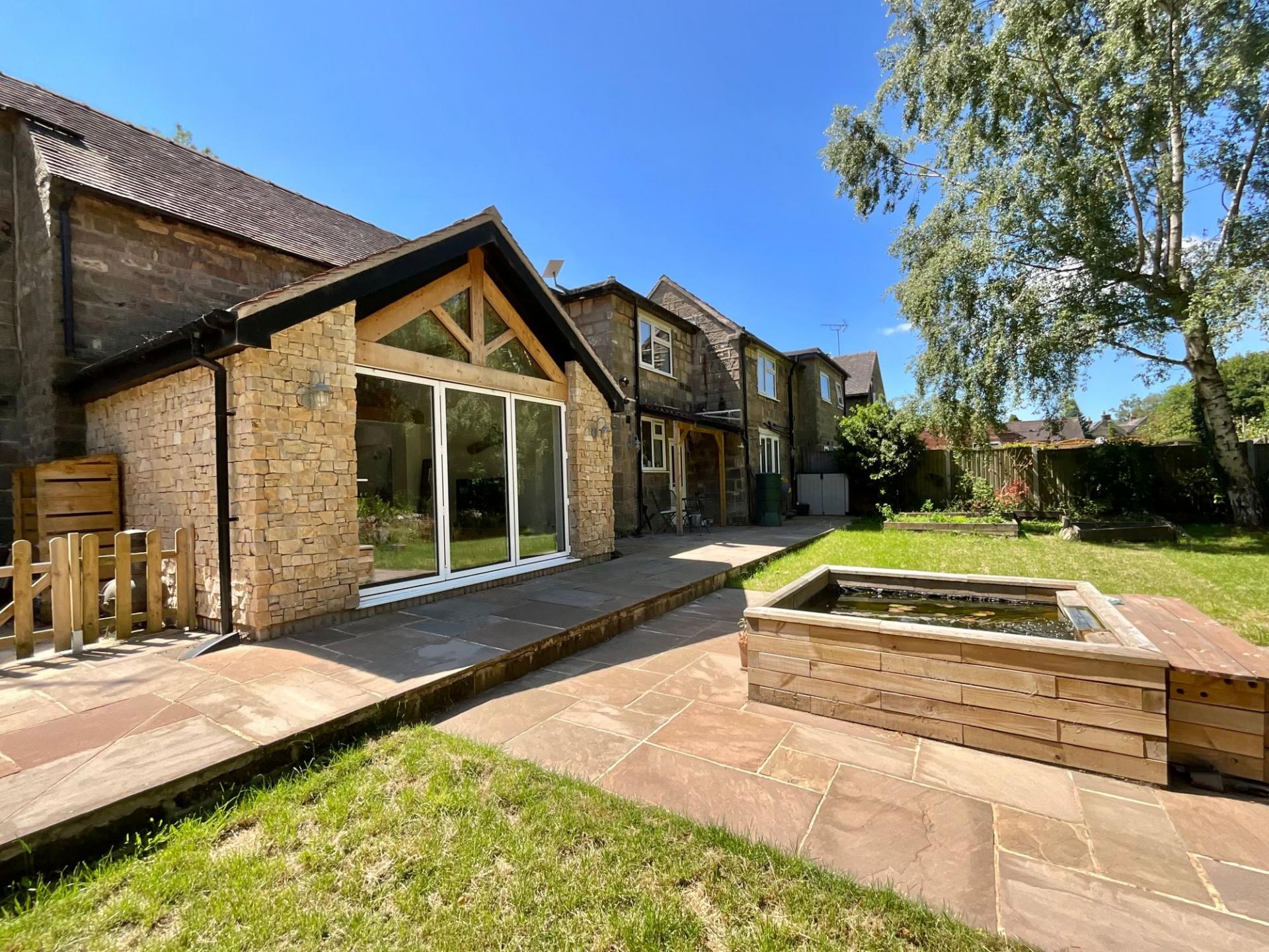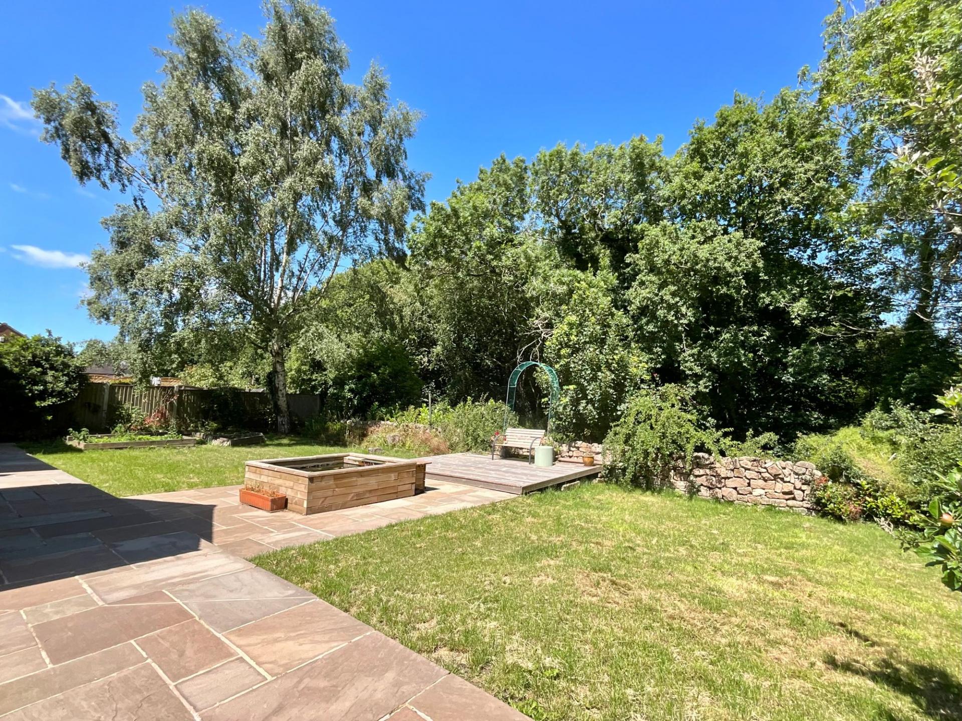 - Expansive landscaped garden with raised pond, Raj Green Indian stone, decking, perfect for outdoor living.