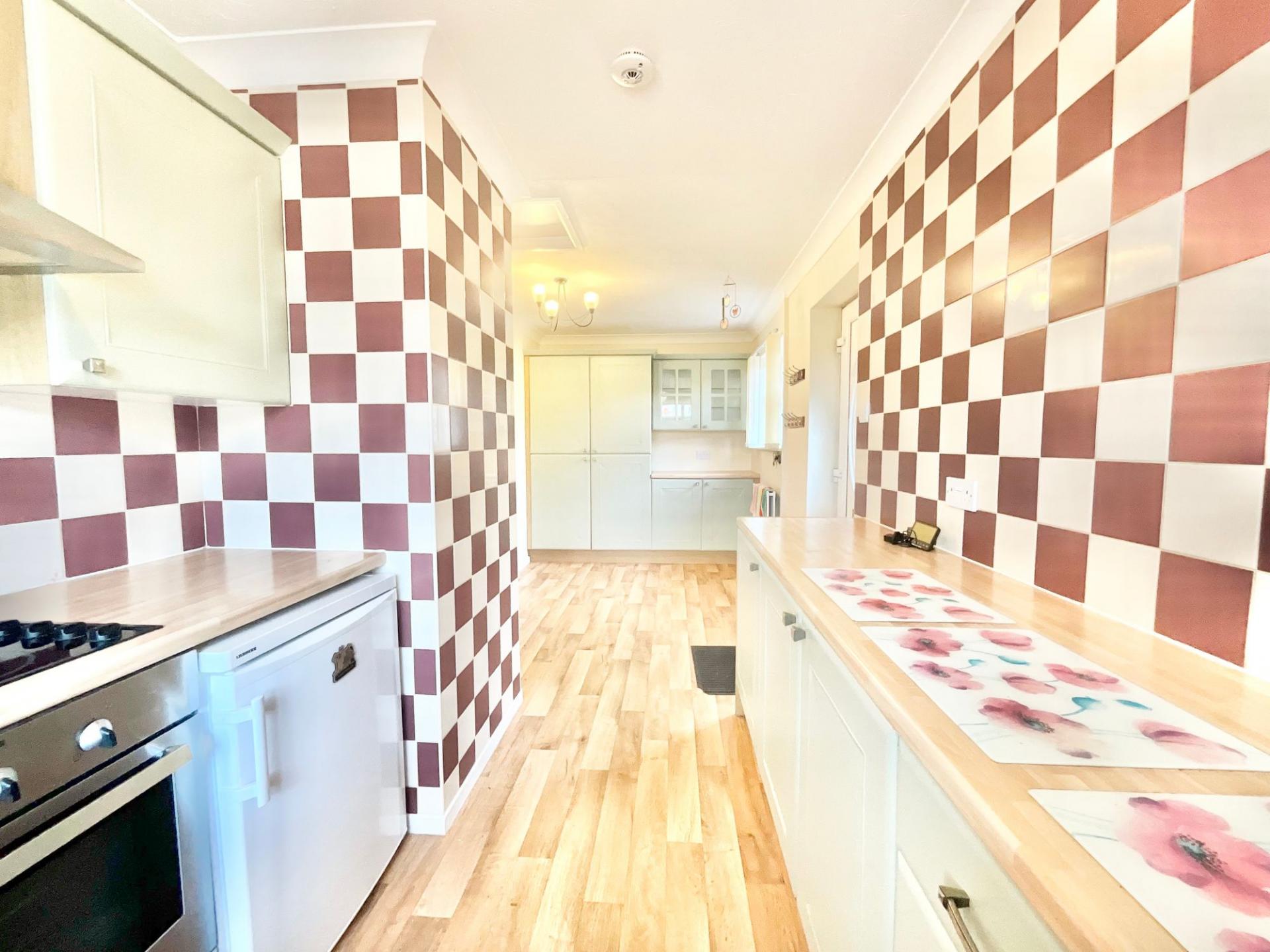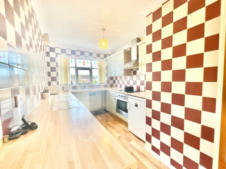 - Spacious kitchen/diner with sage-green cabinetry and ample storage.