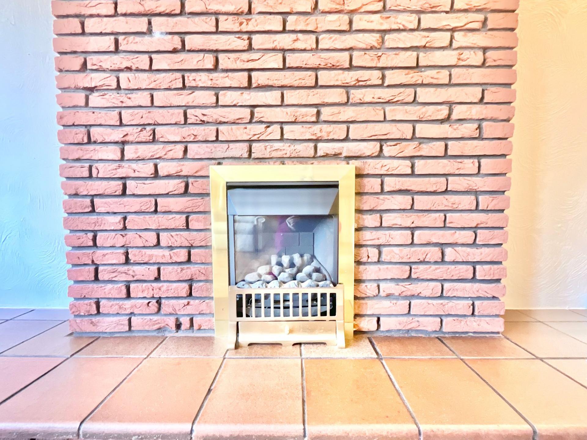 - Bright lounge with bay window and exposed brick fireplace.