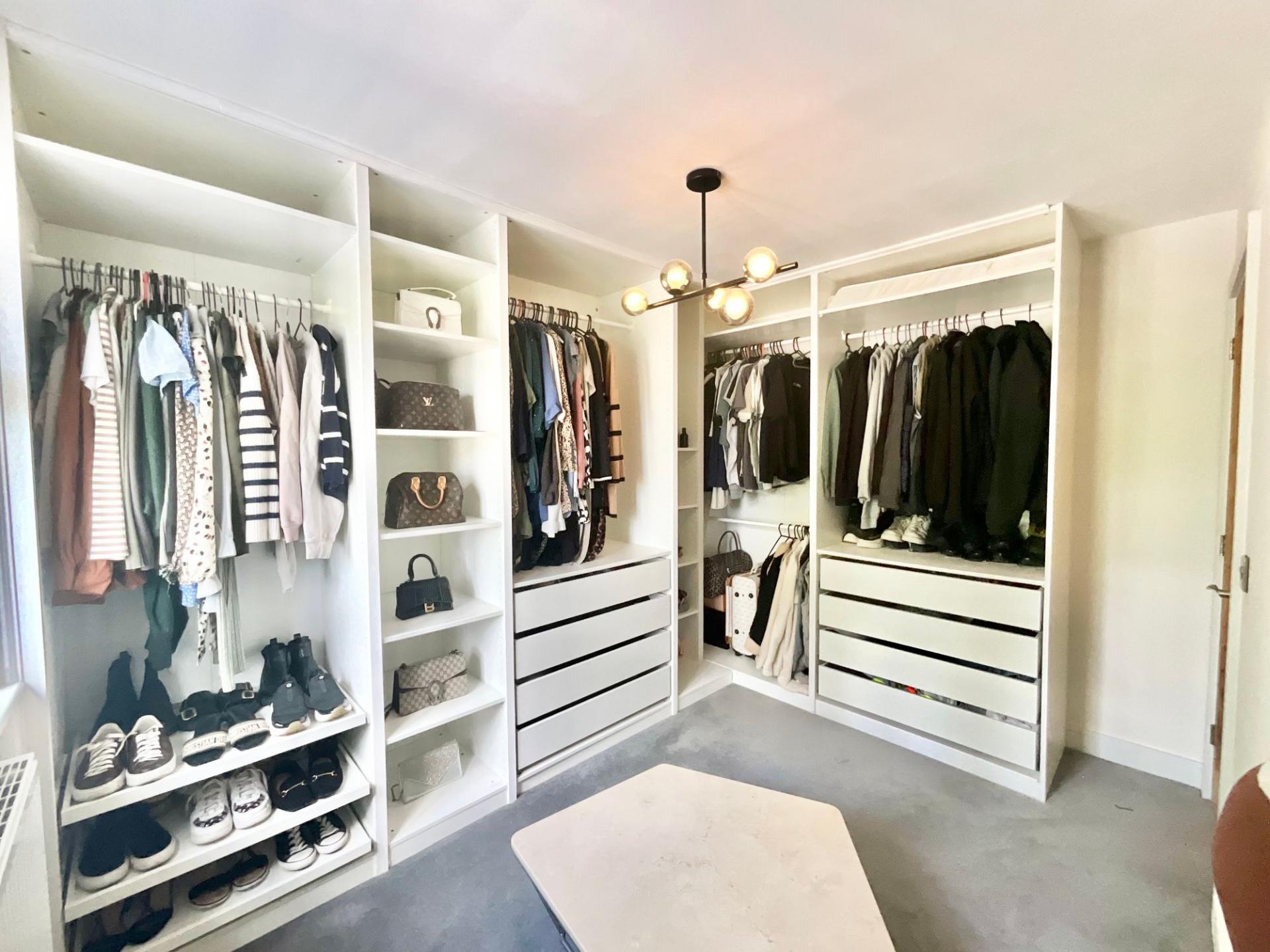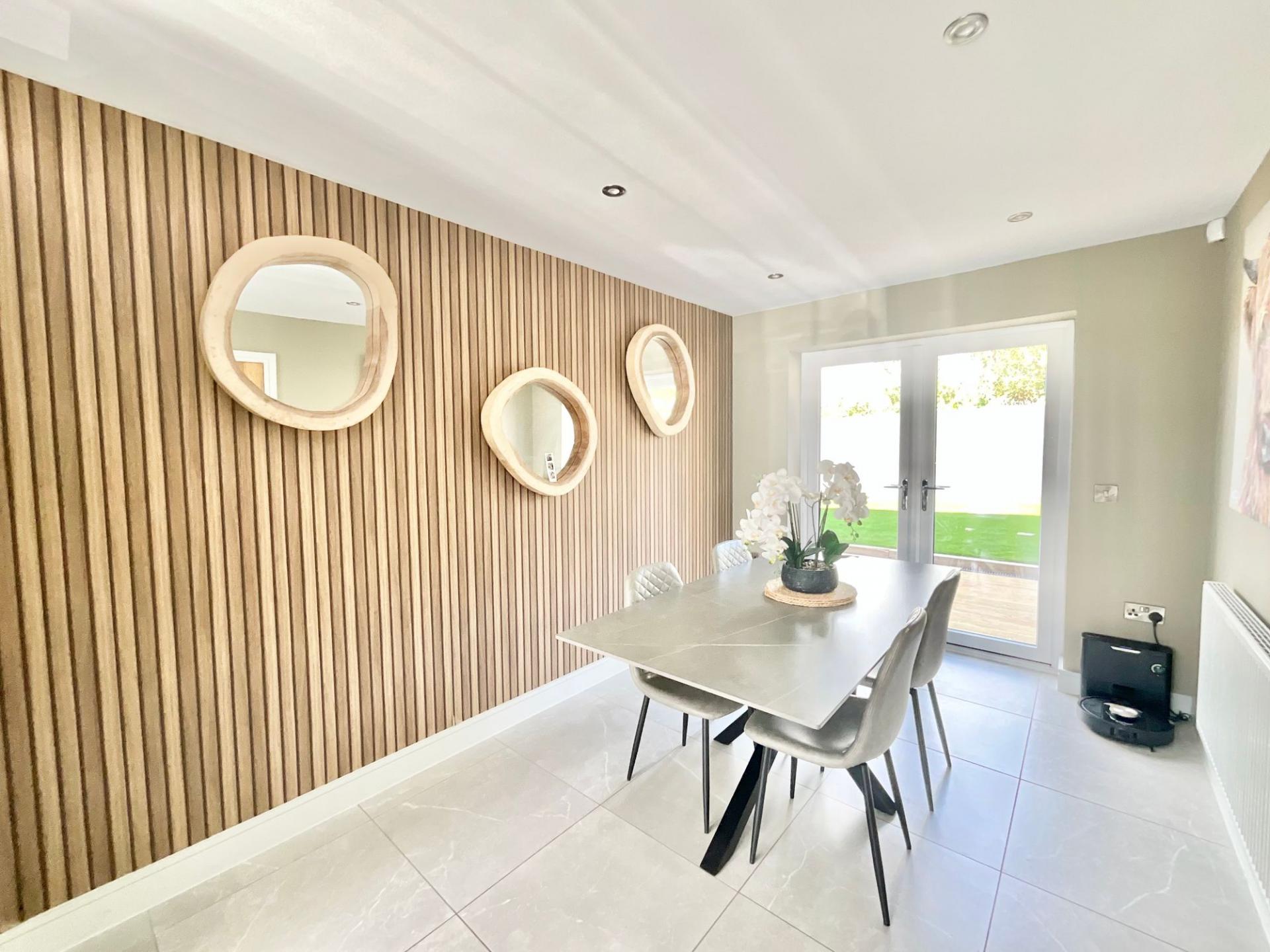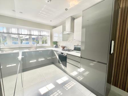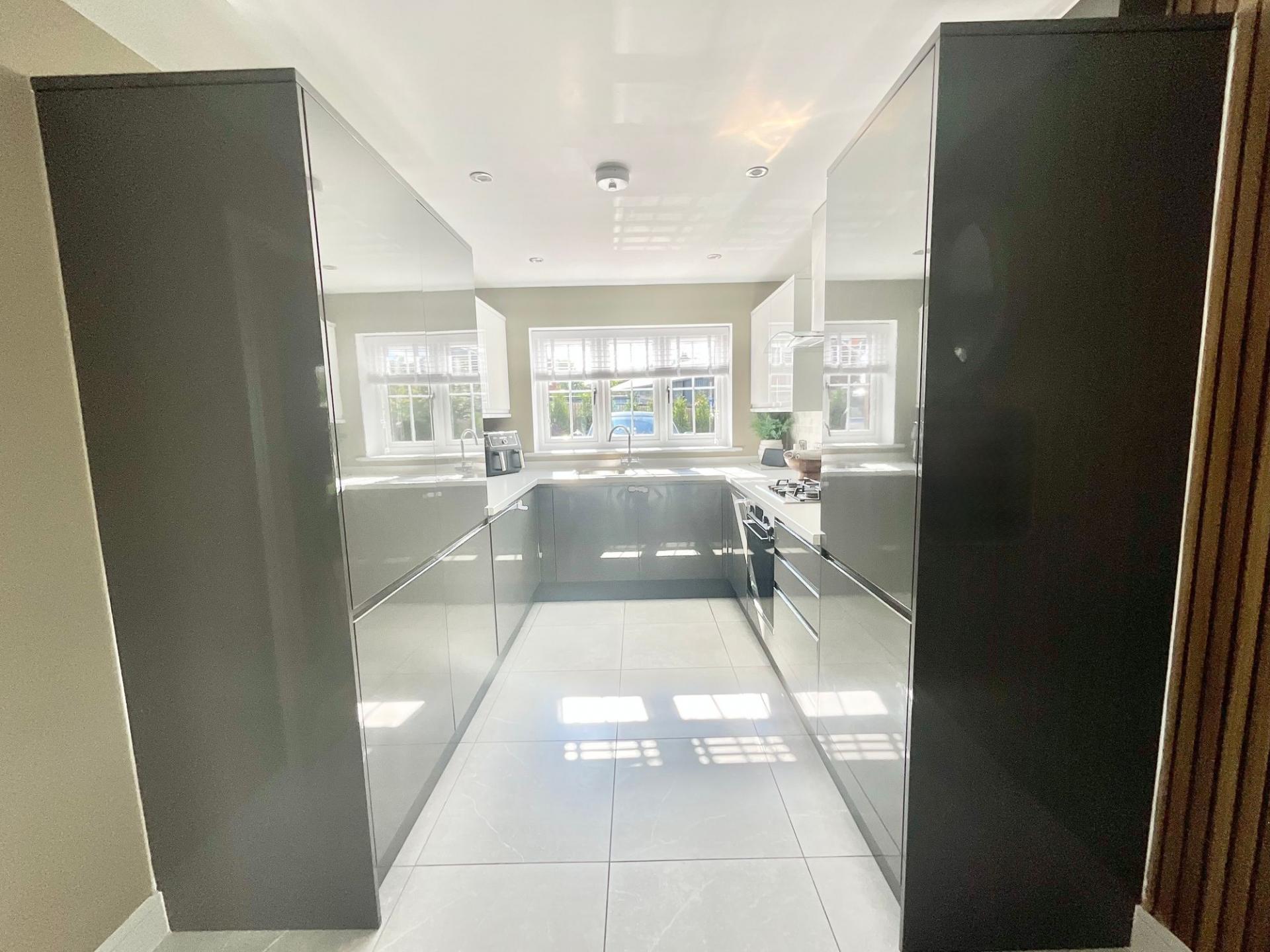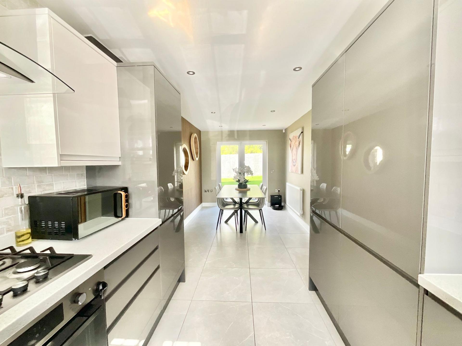 - A large open plan kitchen diner. Featuring sleek, glossy cabinets, toped with white countertops on the bottom and white glossy cabinets on top room for a large dining table.