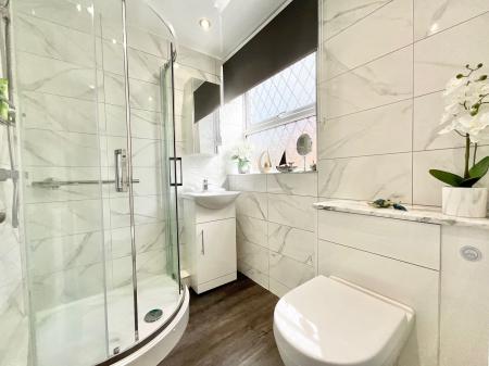 - Stylish kitchen and elegant shower room, beautifully finished with sparkling surfaces and marble-effect tiles.