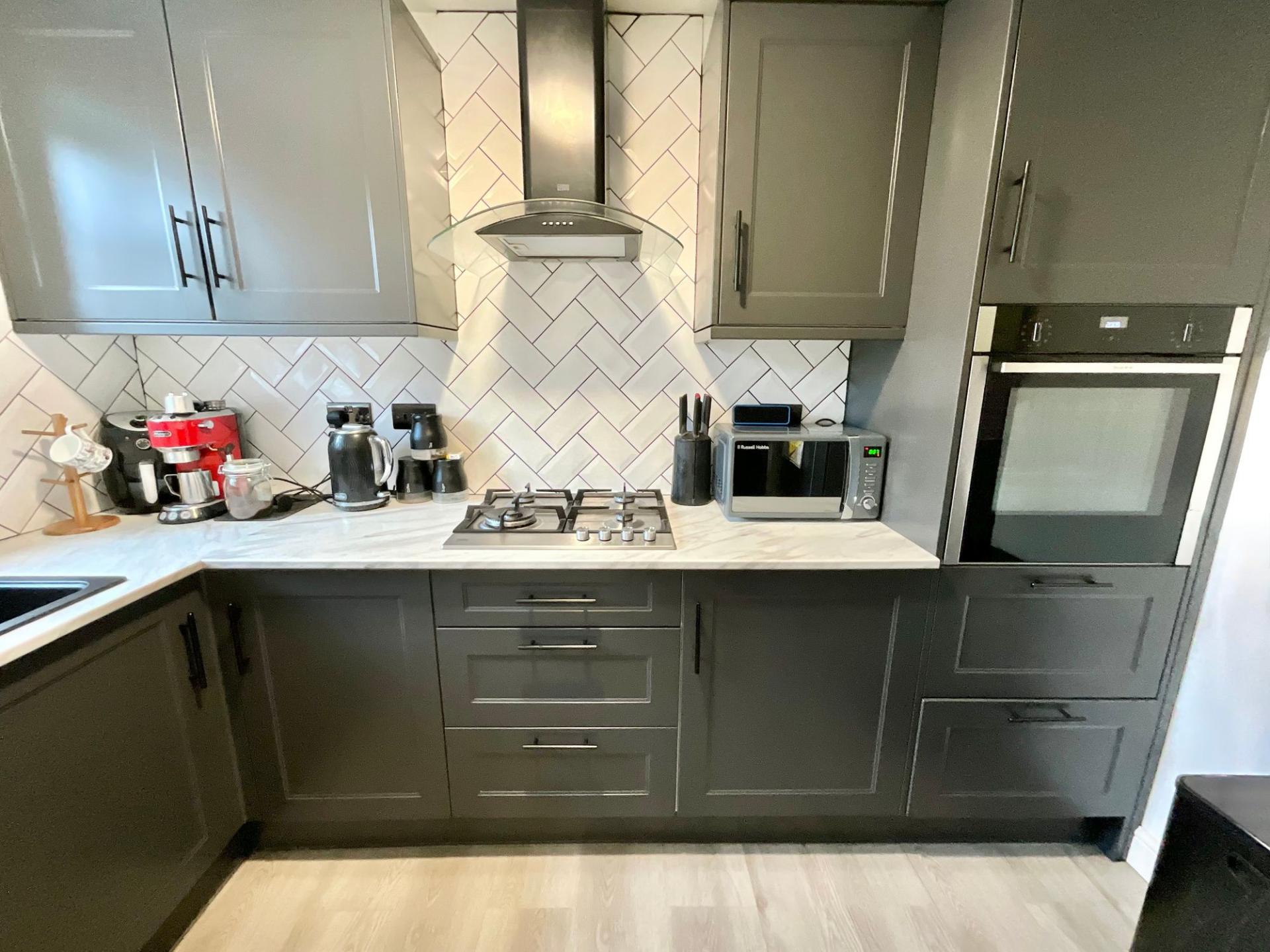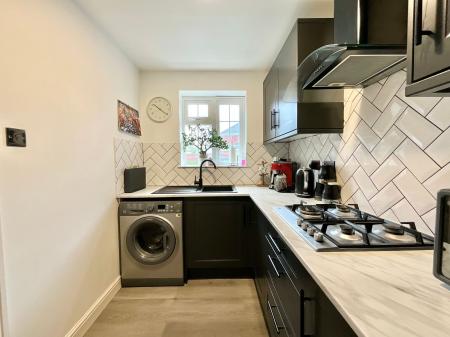 - A monochrome finish kitchen complete with black shaker style cabinets and a marble effect work top. The lounge sports a patio door on to the rear garden beyond.