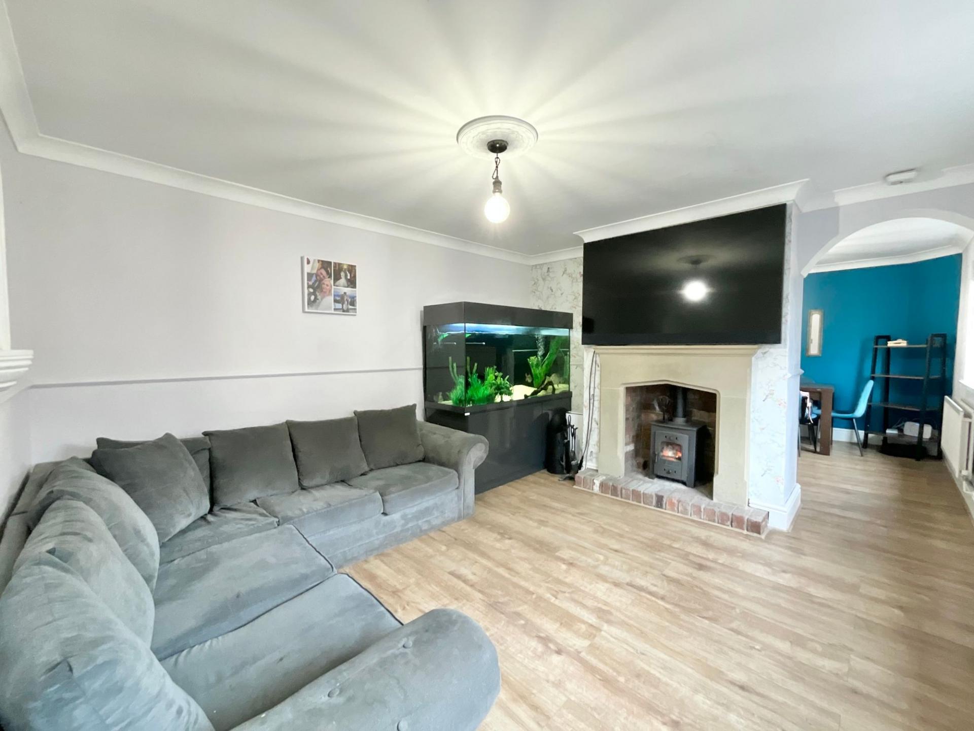 - B — Beautifully Presented Interiors with a cosy lounge with multi-fuel burner set in a Derbyshire stone surround, stylish feature details, and light-filled rooms throughout.