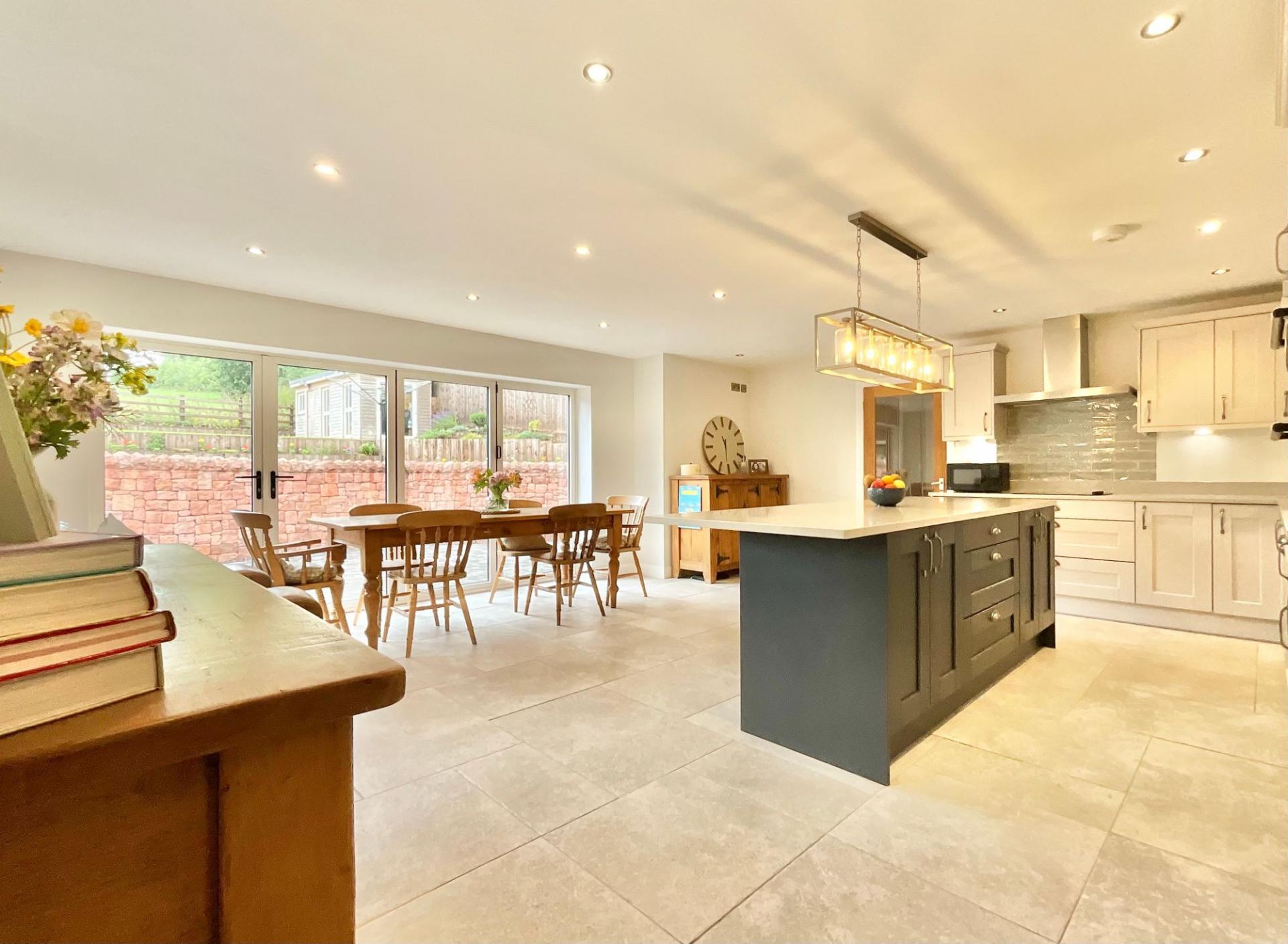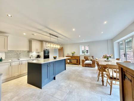 - Open-plan kitchen/family/dining with quartz tops, island, bifolds & integrated appliances